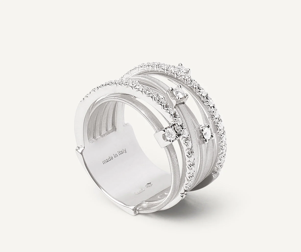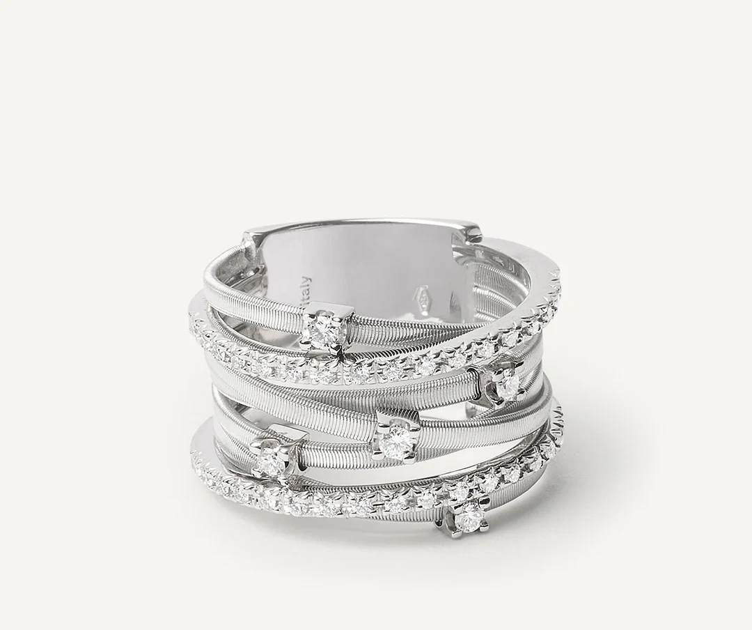 Anello a sette fili con castoni e barrette di diamanti e oro bianco