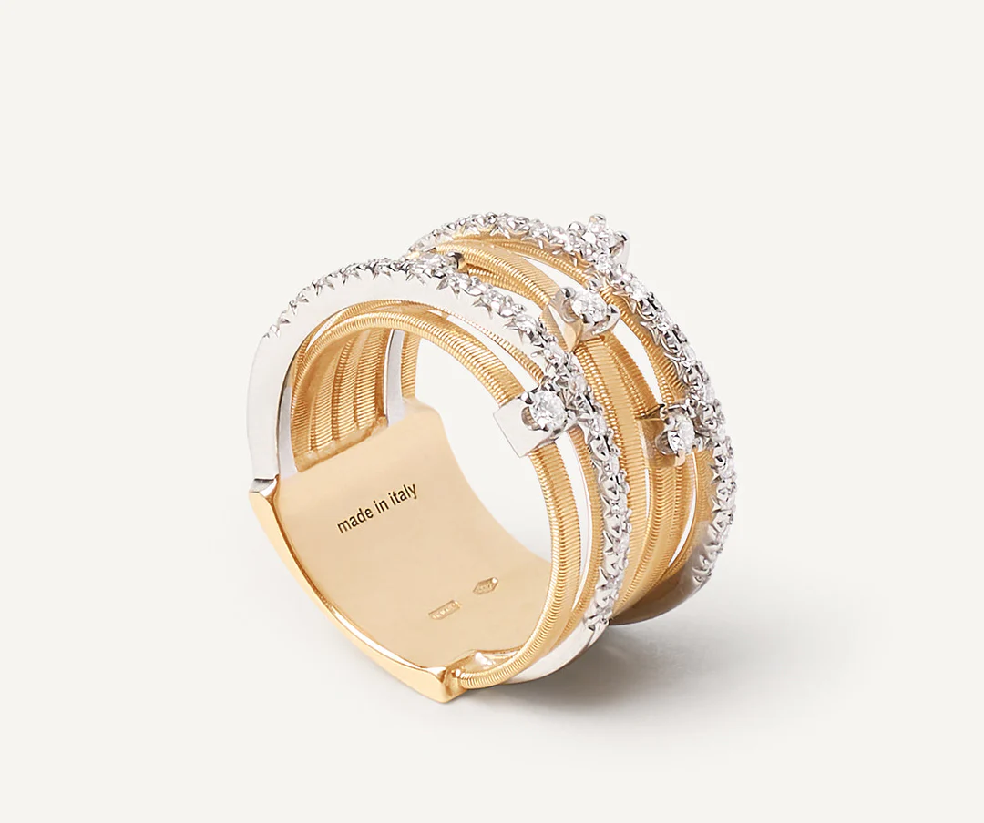 Anello a sette fili con castoni e barrette di diamanti in oro giallo
