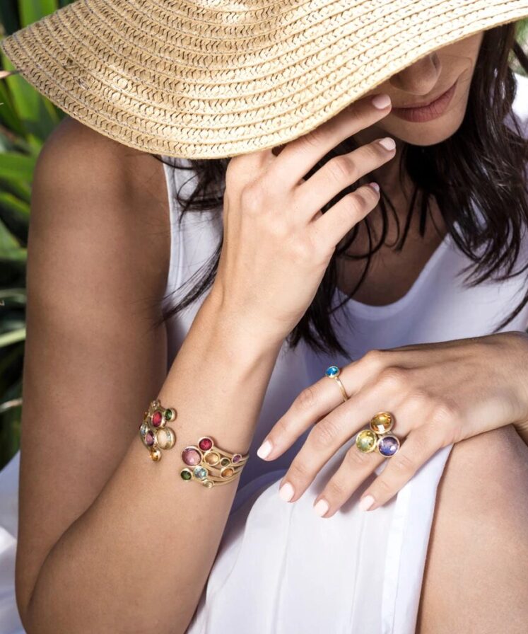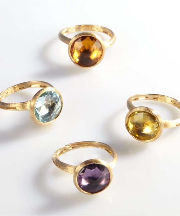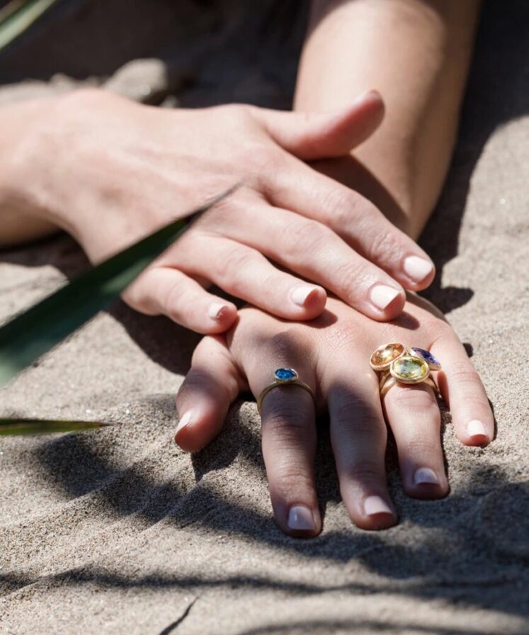 Anello impilabile medio con cuscino taglio rosa citrino limone. Ispirato al tramonto indiano tropicale e all’eredità di Jaipur, questo anello di gemme multicolore a colori Jaipur è inciso a mano da artigiani italiani.