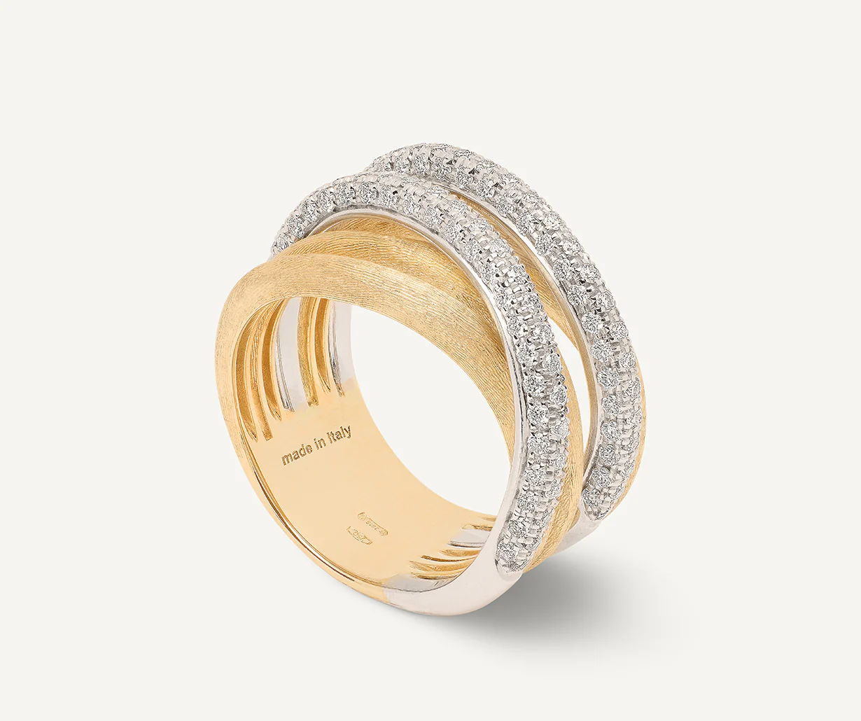 Un anello sofisticato ed elegante che intreccia due fedine impreziosite da pavé di diamanti taglio brillante a fasce in oro giallo 18kt, finemente incise a mano con l’antica tecnica del bulino millerighe.