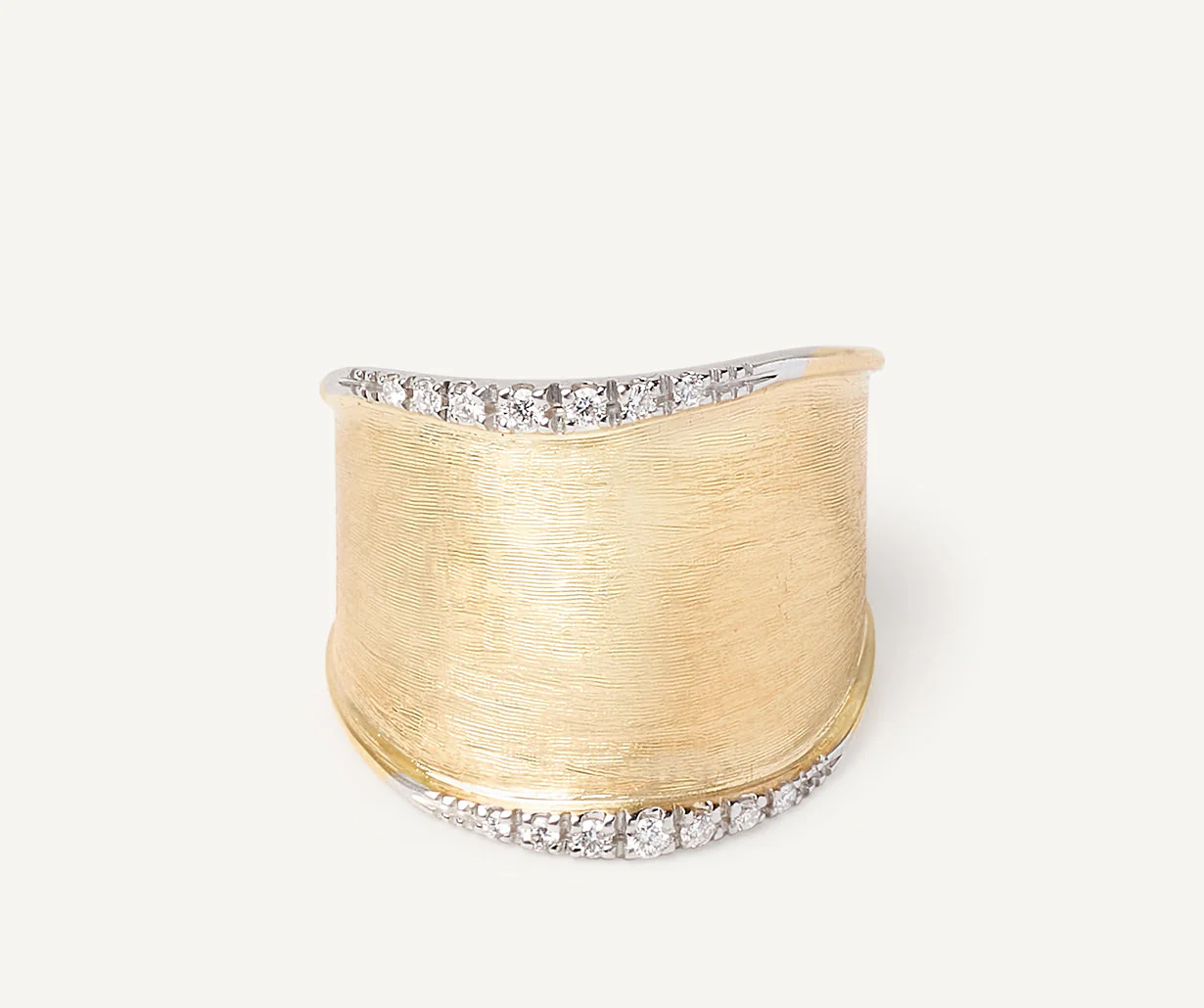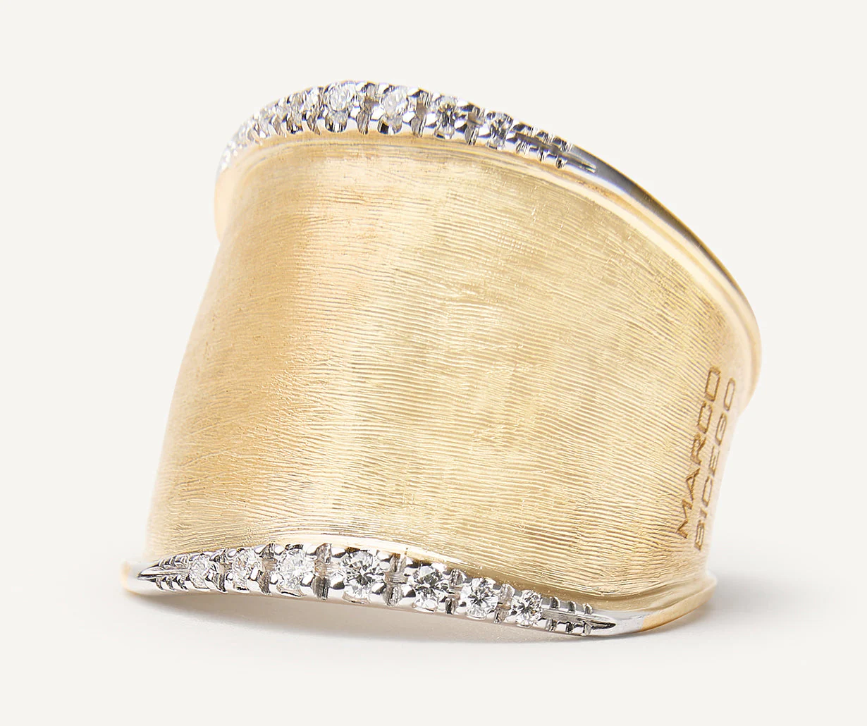 Uno splendido anello a fascia in oro giallo 18kt, dai profili irregolari e dal design lineare, finemente inciso a mano con l’antica tecnica del bulino millerighe e impreziosito da eleganti parentesi di pavé di diamanti taglio brillante.