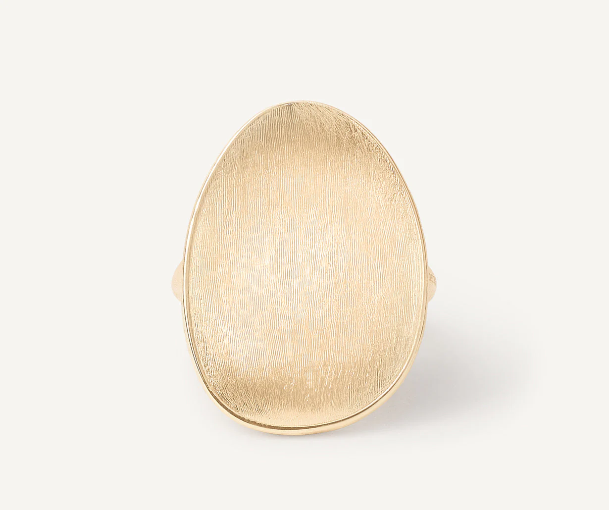 Anello cocktail dal design elegante e dalla superficie irregolare. In oro giallo 18kt, è finemente inciso a mano con l’antica tecnica del bulino millerighe, per un effetto di straordinaria lucentezza e setosità al tatto.