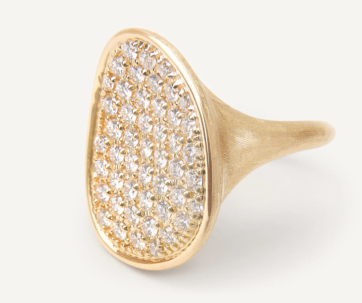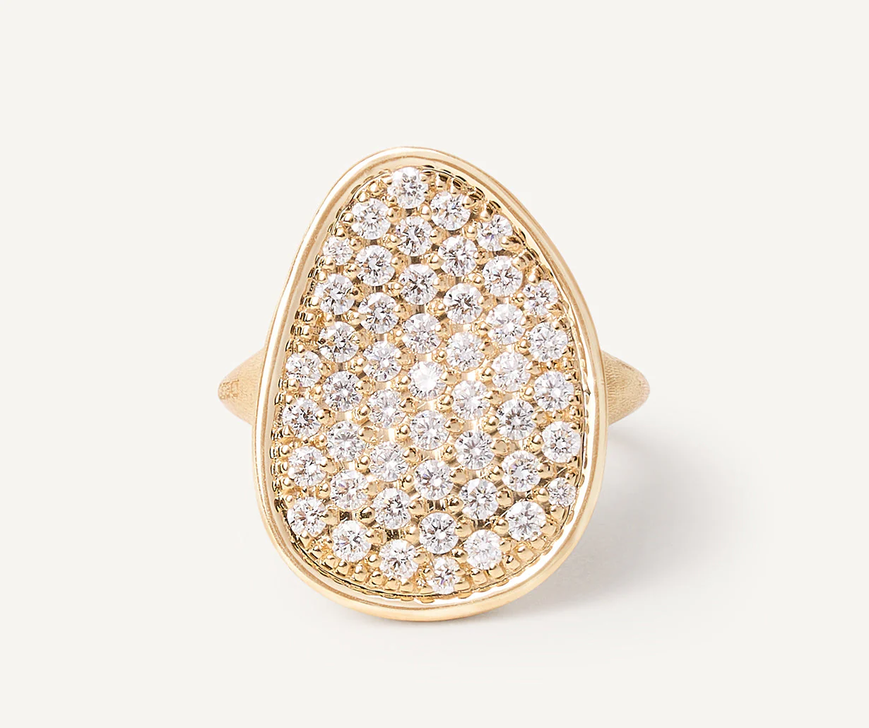 Un’elegante foglia di pavé di diamanti taglio brillante adorna questo delicatissimo anello in oro giallo 18kt, rendendolo ancora più prezioso. L’oro è finemente inciso a mano con l’antica tecnica del bulino millerighe.