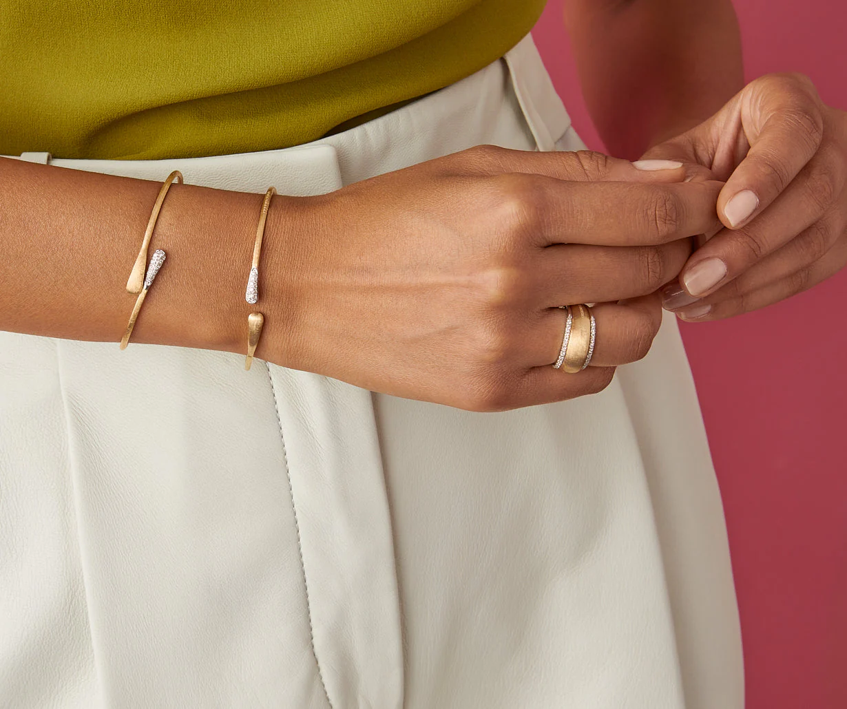 Un delicato bracciale rigido in oro giallo 18kt, inciso a mano con l’antica tecnica del bulino millerighe, impreziosito da una goccia di pavé di diamanti taglio brillante. Raffinato ed elegante, è perfetto da solo, o indossato in abbinamento agli altri gioielli Marco Bicego.