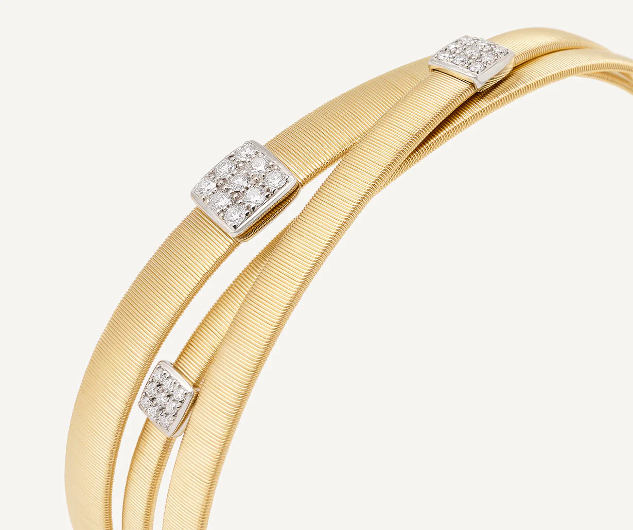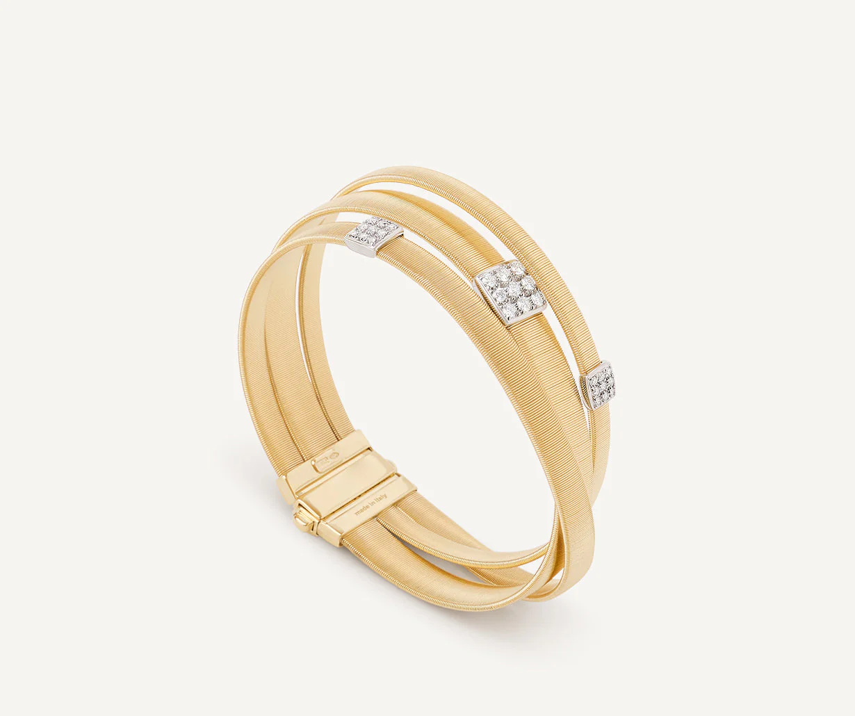 Questo bellissimo bracciale multifilo, in lavorazione coil piatta, è bold ed elegante. In oro giallo 18kt, monta pavé di diamanti taglio brillante, e vanta una vestibilità unica.