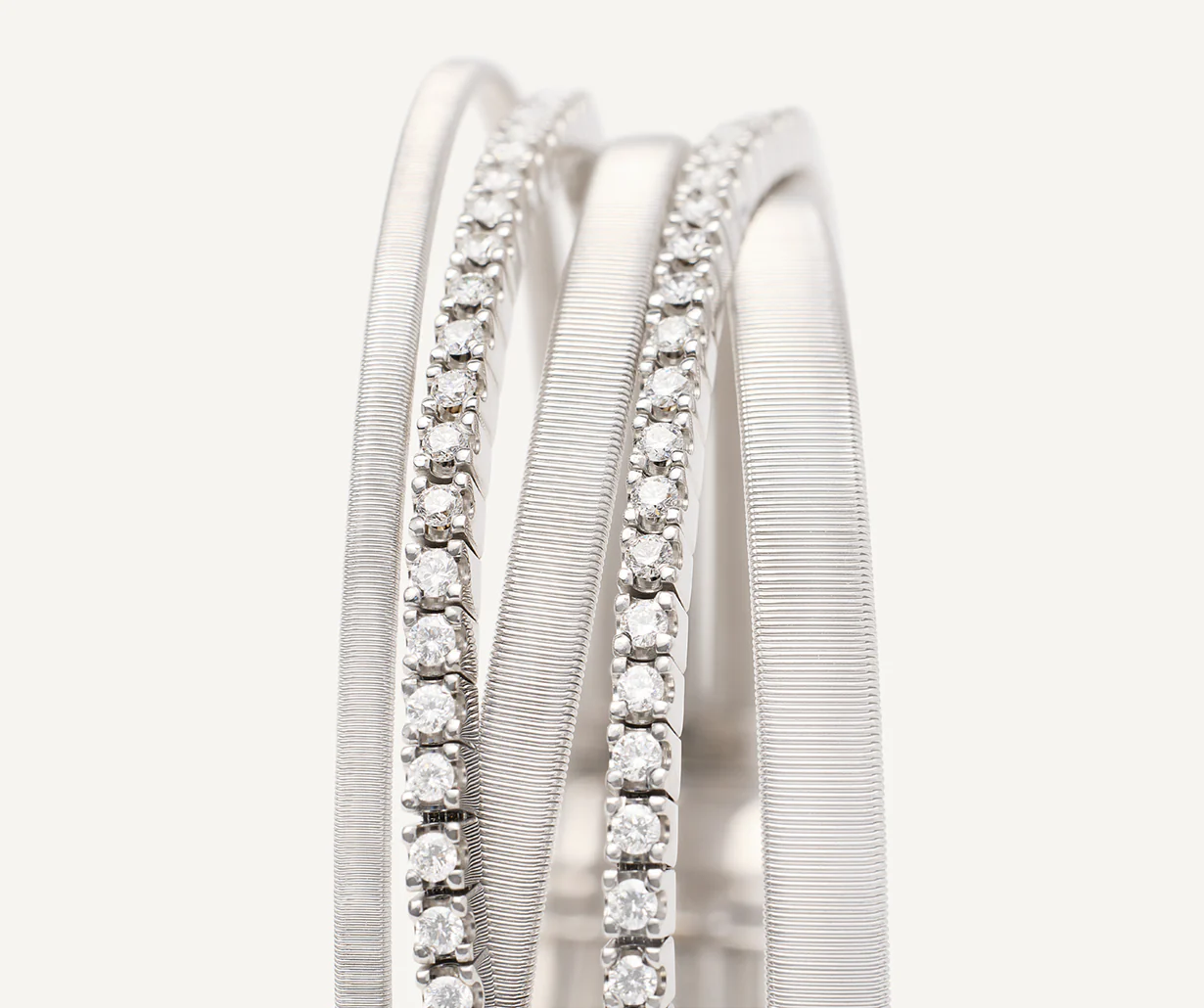 Meraviglioso bracciale in oro bianco a tre fili di spirale piatta, realizzata grazie all’esclusiva lavorazione artigianale del coil, e a due fili con tennis di diamanti. Dalla vestibilità morbida e sorprendente, è un gioiello che qualsiasi donna vorrebbe al suo polso.