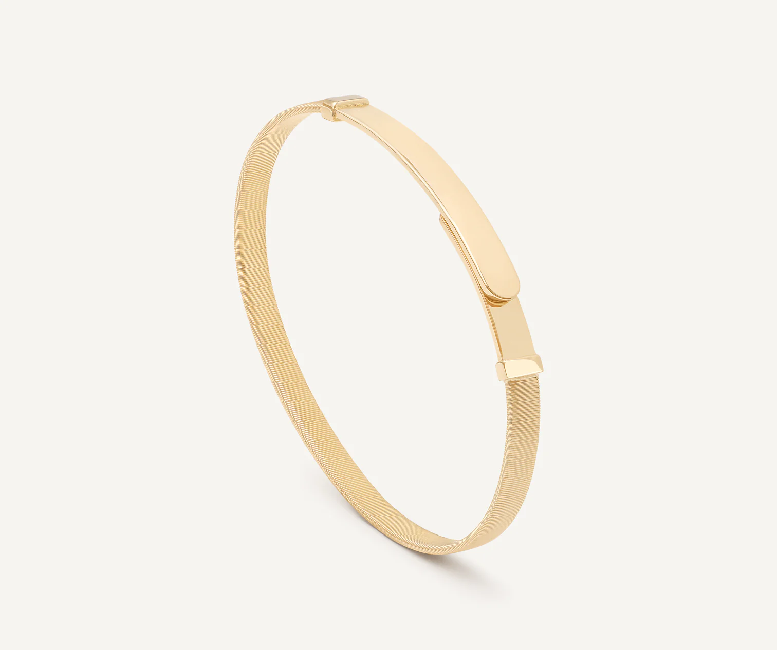 Dallo stile pulito ed elegante, questo bracciale rigido in oro giallo 18 carati è realizzato grazie all’esclusiva lavorazione artigianale del coil. Perfetto da solo e splendido abbinato agli altri bracciali della collezione, è facile da indossare e togliere grazie alla chiusura integrata abilmente nascosta sotto il motivo centrale.