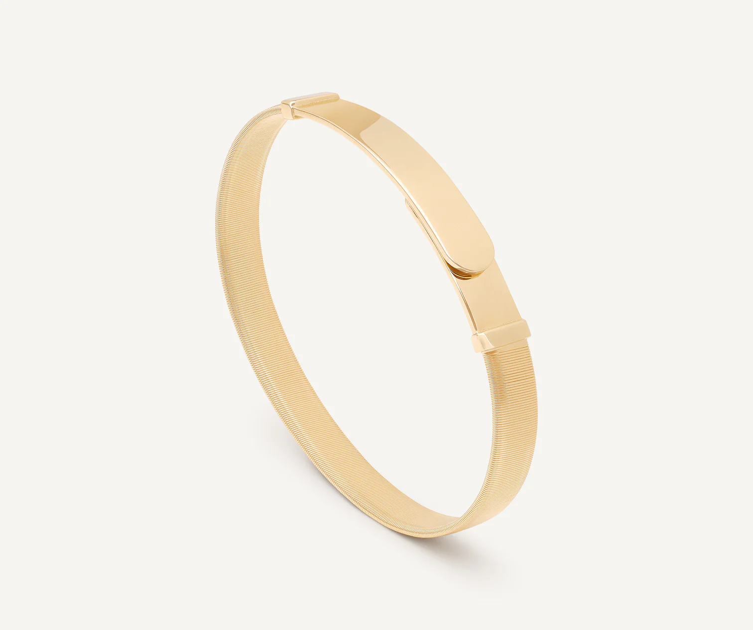 Dallo stile pulito ed elegante, questo bracciale rigido in oro giallo 18 carati è realizzato grazie all’esclusiva lavorazione artigianale del coil. Perfetto da solo e splendido abbinato agli altri bracciali della collezione, è facile da indossare e togliere grazie alla chiusura integrata abilmente nascosta sotto il motivo centrale.