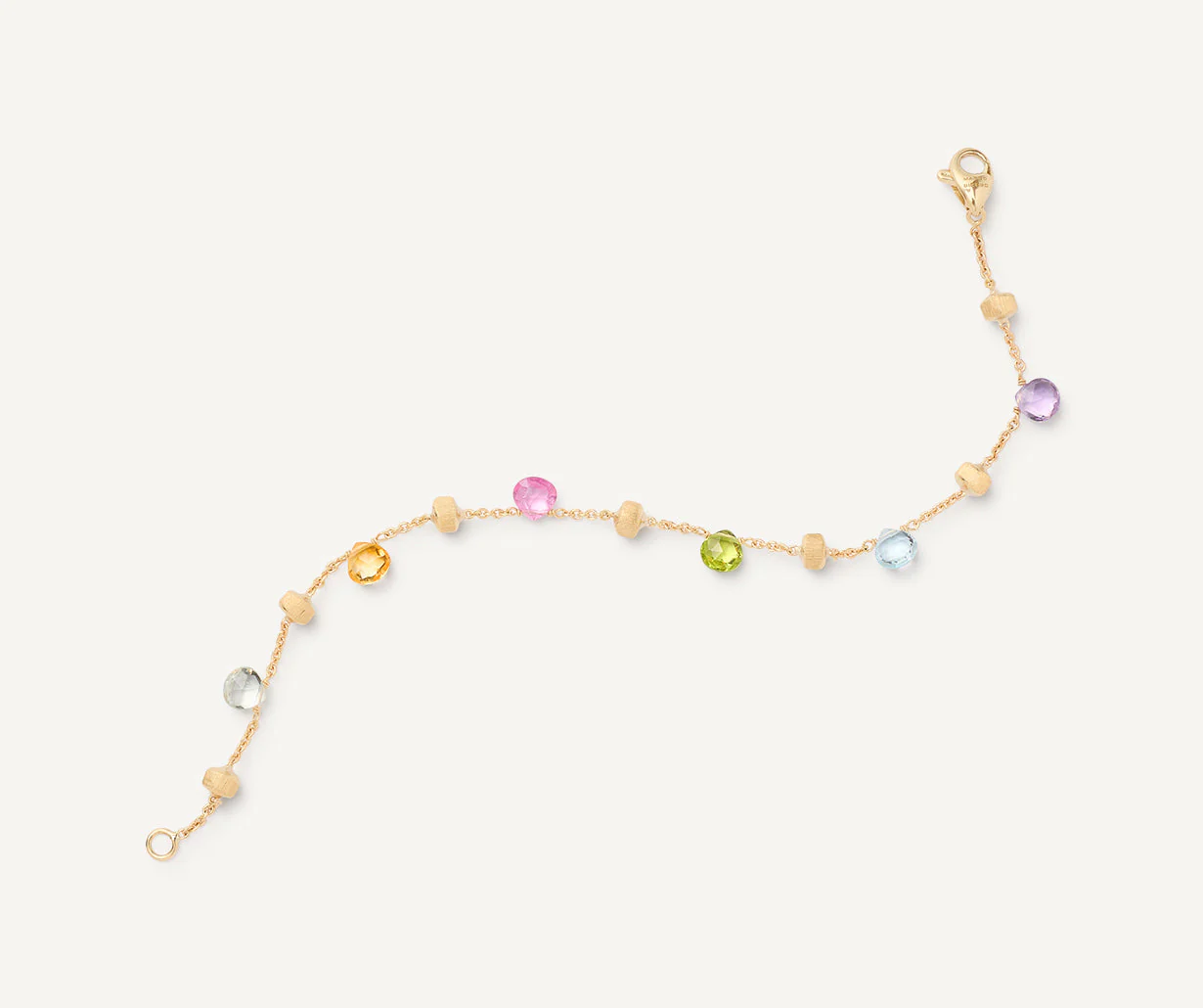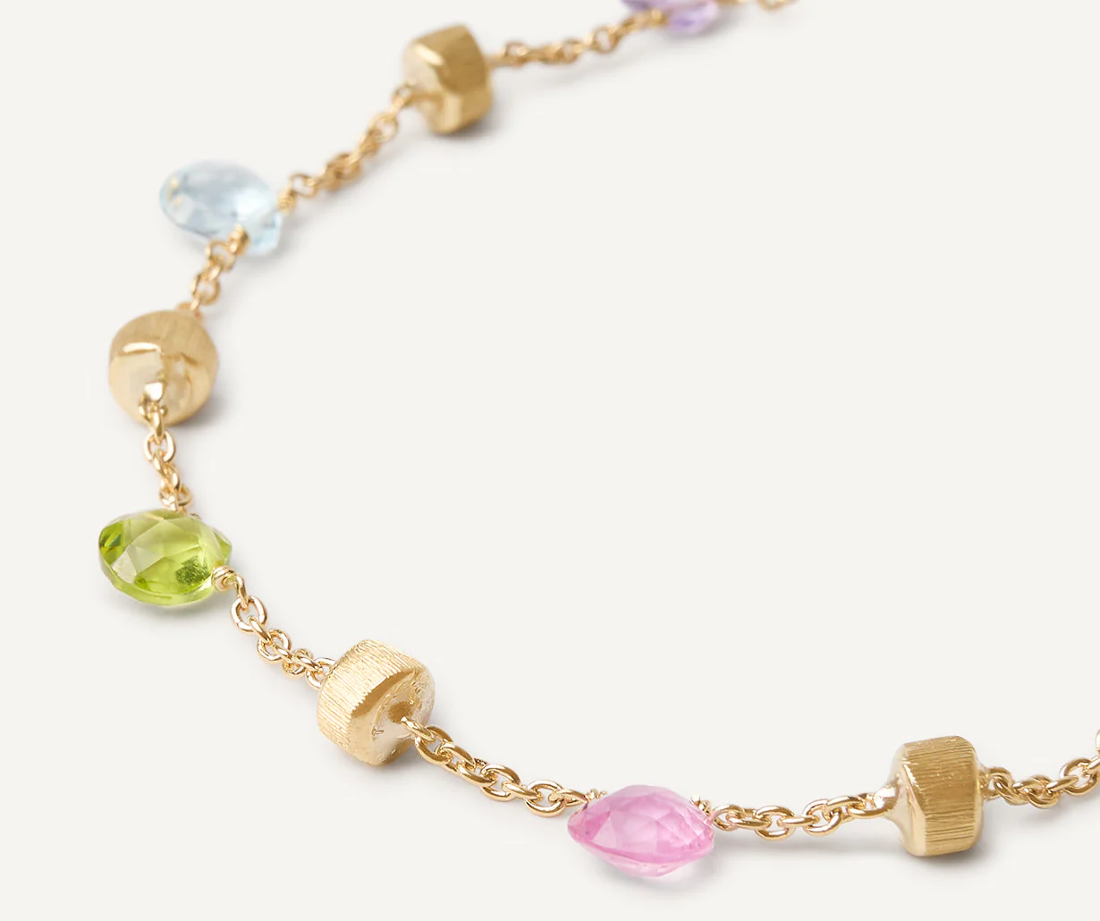 Un bracciale leggero, elegante, perfetto indossato da solo o abbinato agli altri gioielli Marco Bicego. Un vivace mix di gemme naturali dal caratteristico taglio a cuore, intervallate da preziose pepite in oro giallo 18kt, finemente incise a mano con l’antica tecnica del bulino millerighe.