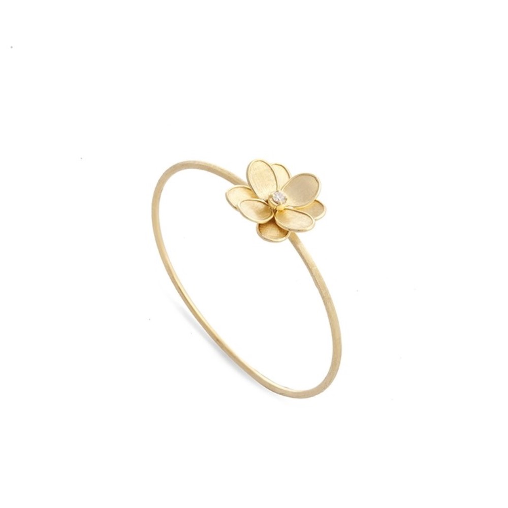 Elegante bracciale rigido con elemento floreale in oro giallo 18kt, finemente inciso a mano con l’antica tecnica del Bulino Millerighe. I petali, racchiudono un Diamante taglio brillante, che rende questo gioiello ancora più sofisticato.