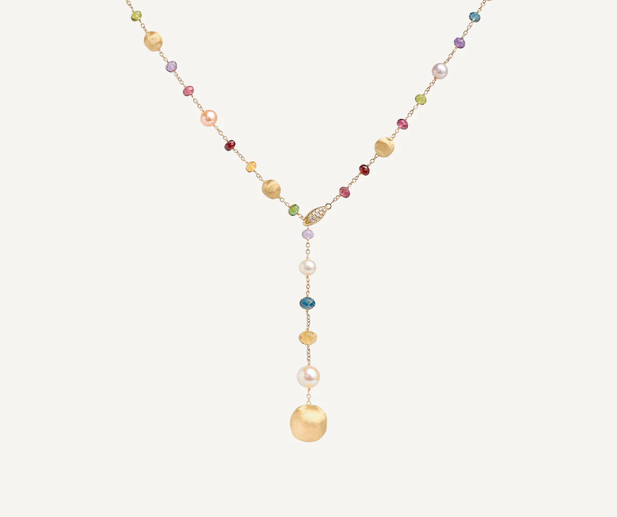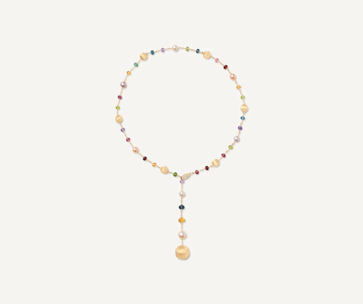 Un prezioso mix di gemme colorate e perle caratterizza questo sofisticato girocollo, con chiusura frontale di pavé di diamanti taglio brillante. Le sfere in oro giallo 18kt sono finemente incise a mano con l’antica tecnica del bulino millerighe, per un effetto di straordinaria lucentezza e setosità al tatto.