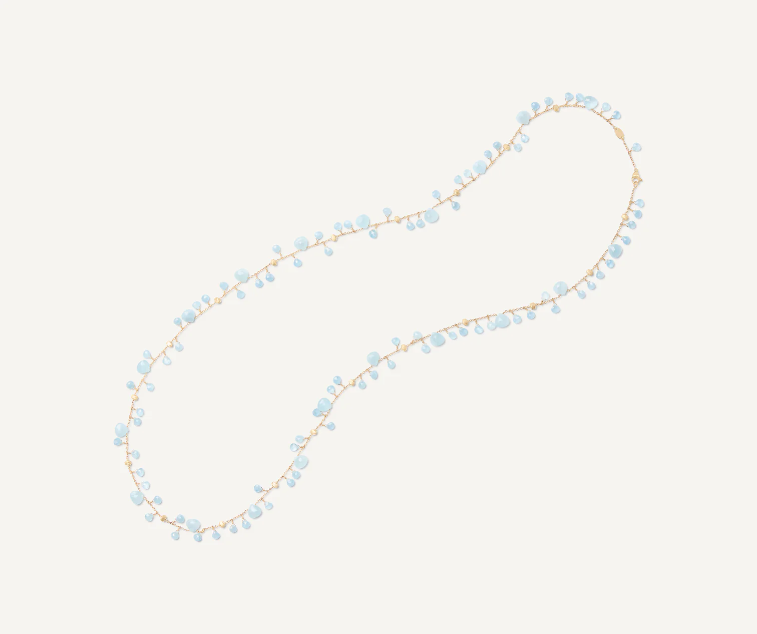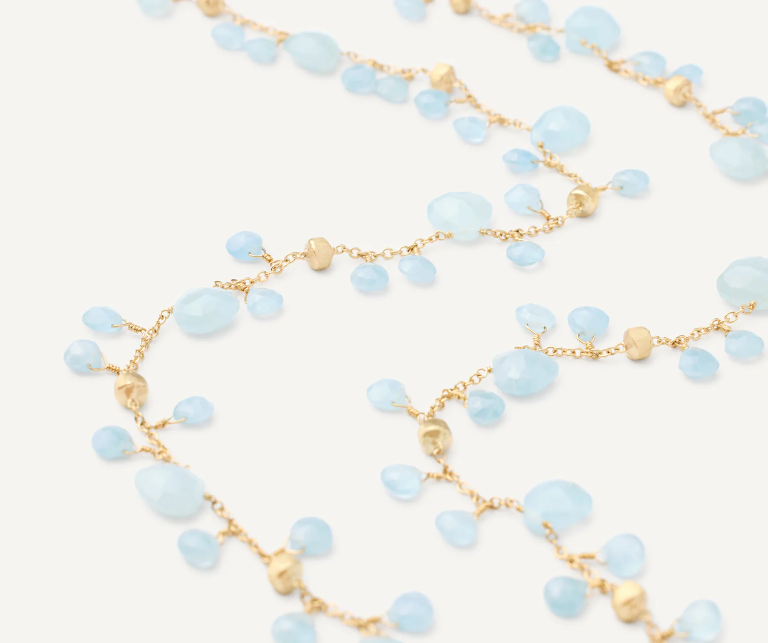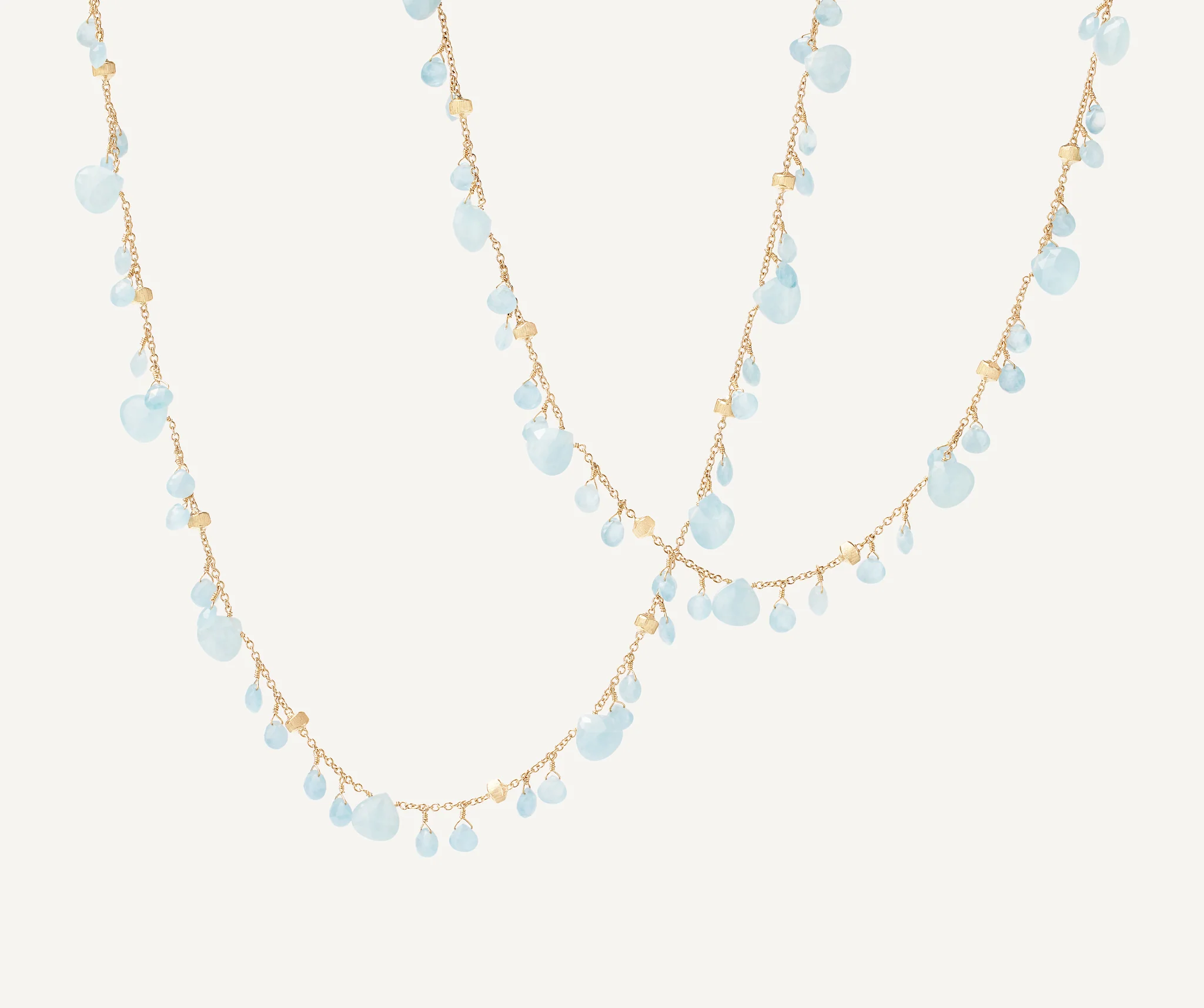 Una meravigliosa collana lunga con pendenti di acquamarina milky dal caratteristico taglio a cuore impreziosita da pepite in oro giallo 18 carati, finemente incise a mano con l’antica tecnica del bulino millerighe. Un gioiello dai colori delicati ed eleganti, perfetto indossato nella sua lunghezza o raddoppiato.
