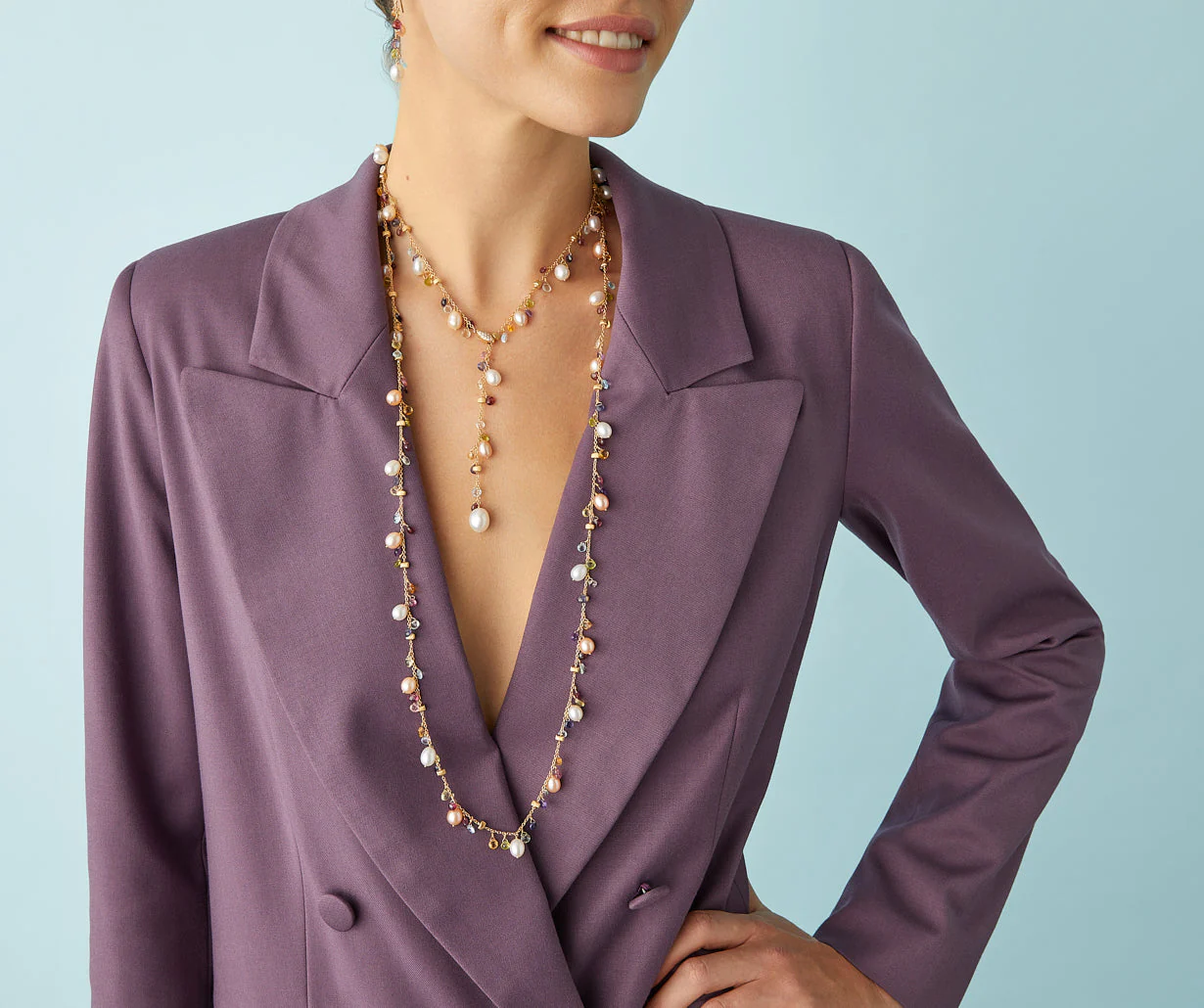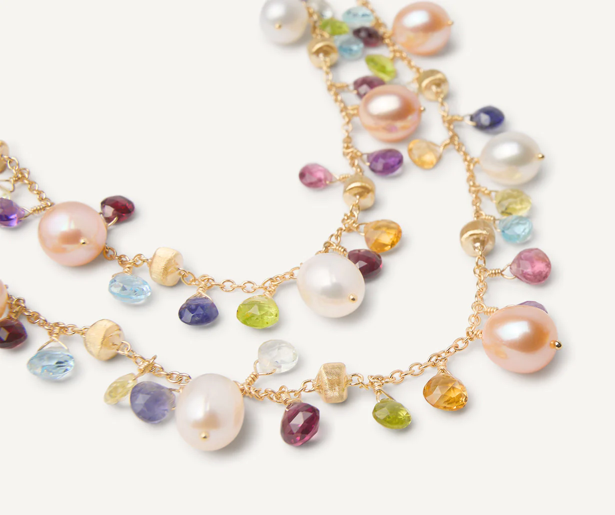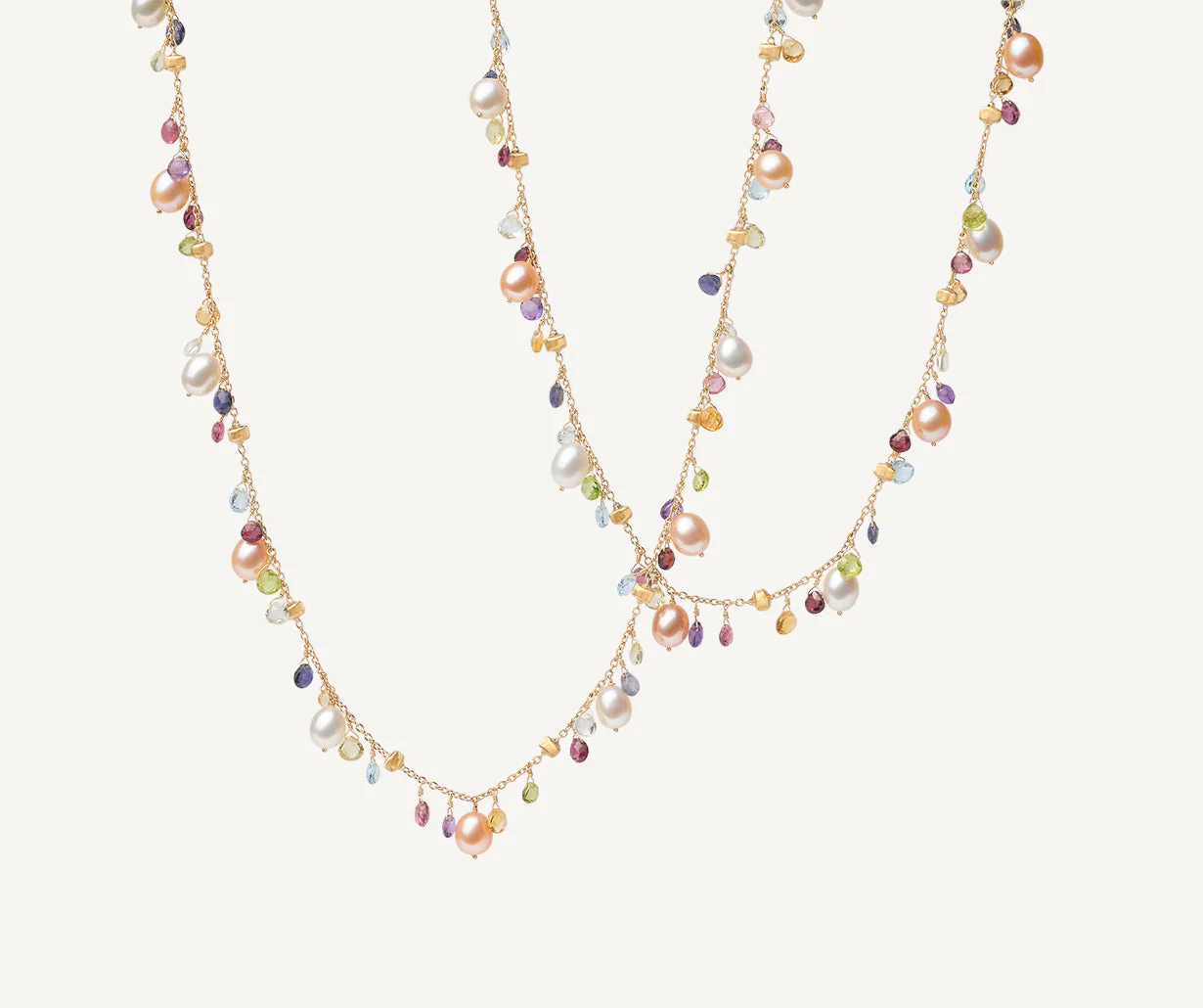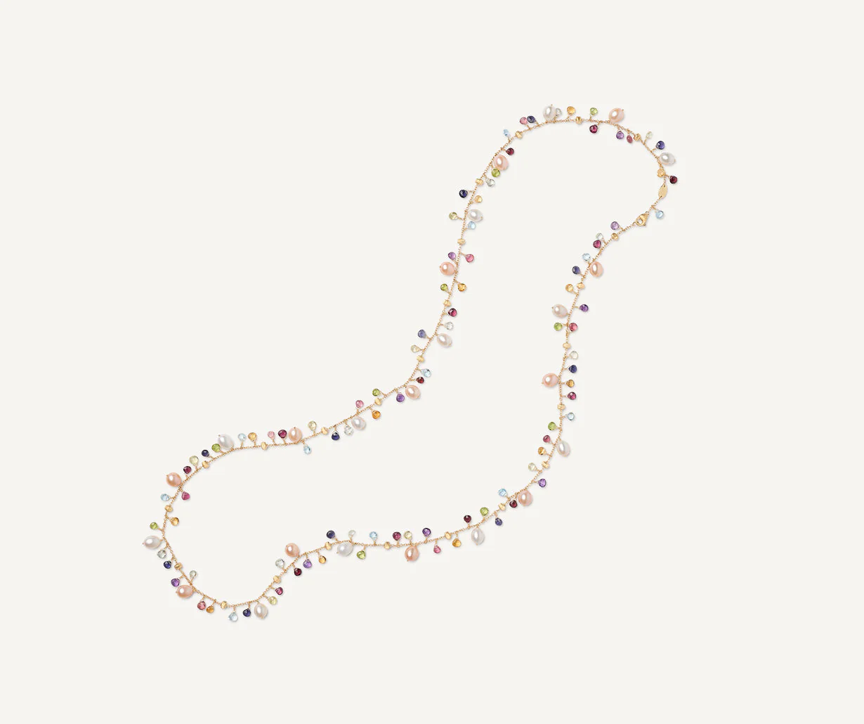 Collana lunga di gemme naturali dal caratteristico taglio a cuore impreziosita da una selezione di perle d’acqua dolce e pepite d’oro giallo 18kt incise a mano con l’antica tecnica del bulino millerighe. Colorata e divertente, è perfetta per dare un tocco di colore a ogni outfit.