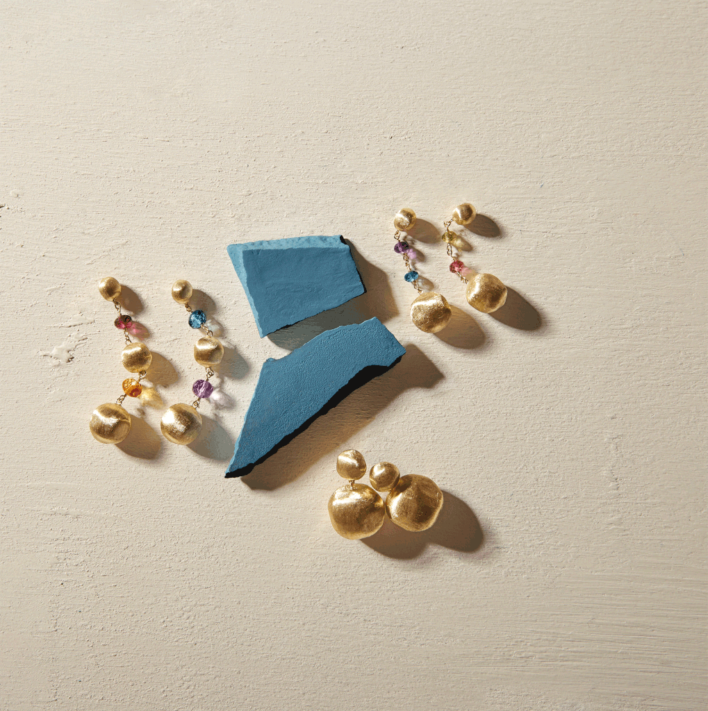 Colorato e divertente questo orecchino in sfere d’oro giallo 18kt, incise a mano con l’antica tecnica del Bulino Millerighe, monta una selezione di delicate Gemme multicolor, che gli conferiscono brio e fresca lucentezza.