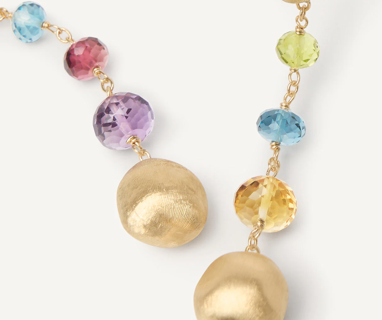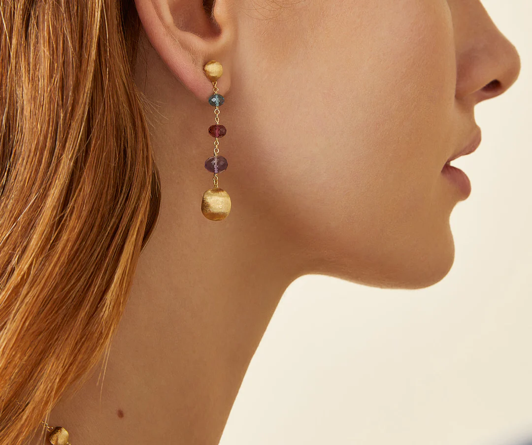 In un perfetto gioco di proporzioni, una preziosa alternanza di gemme di diverso colore in degradé a scalare dona carattere e lucentezza a questo orecchino in sfere d’oro giallo 18kt, finemente incise a mano con l’antica tecnica del bulino millerighe.