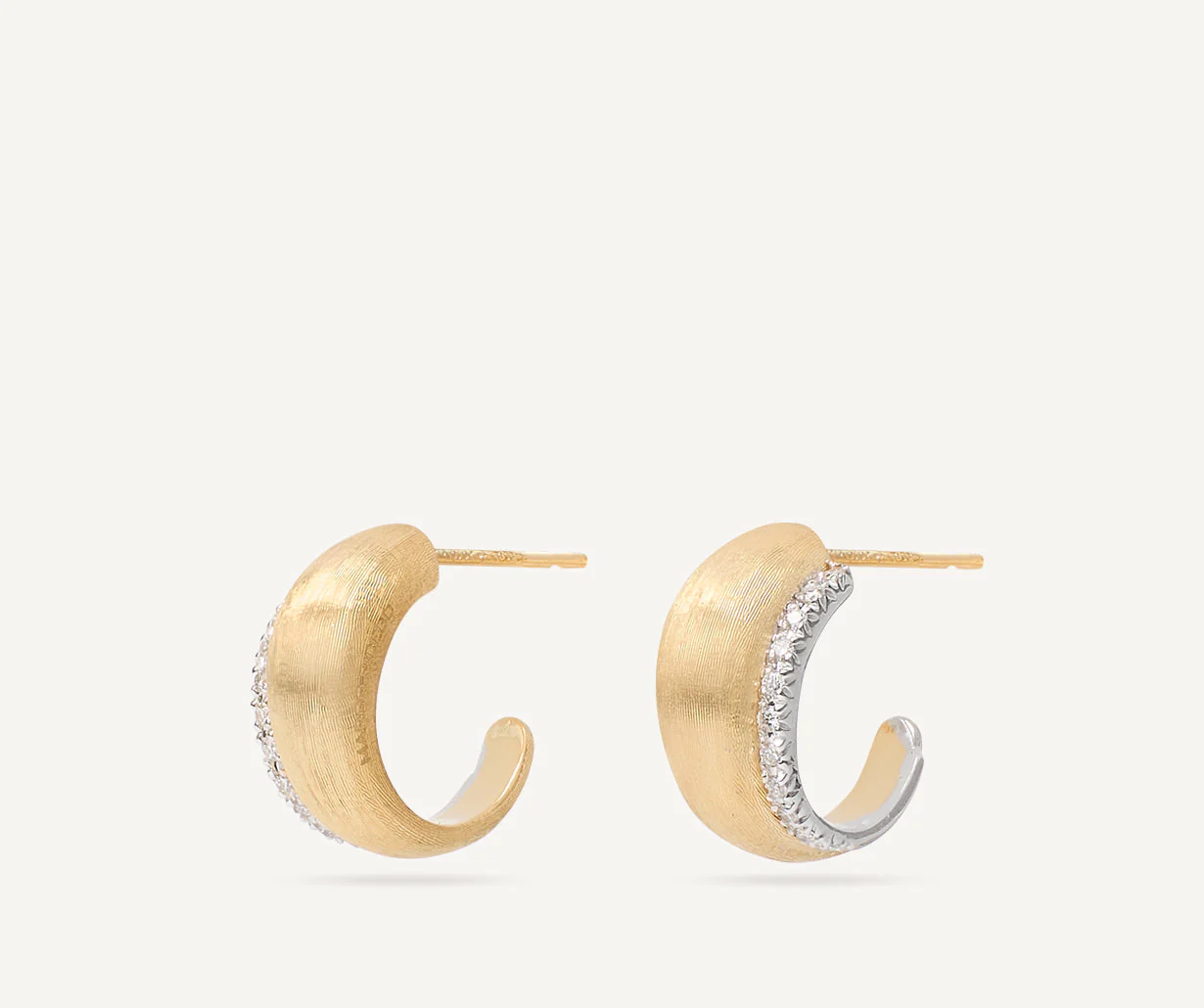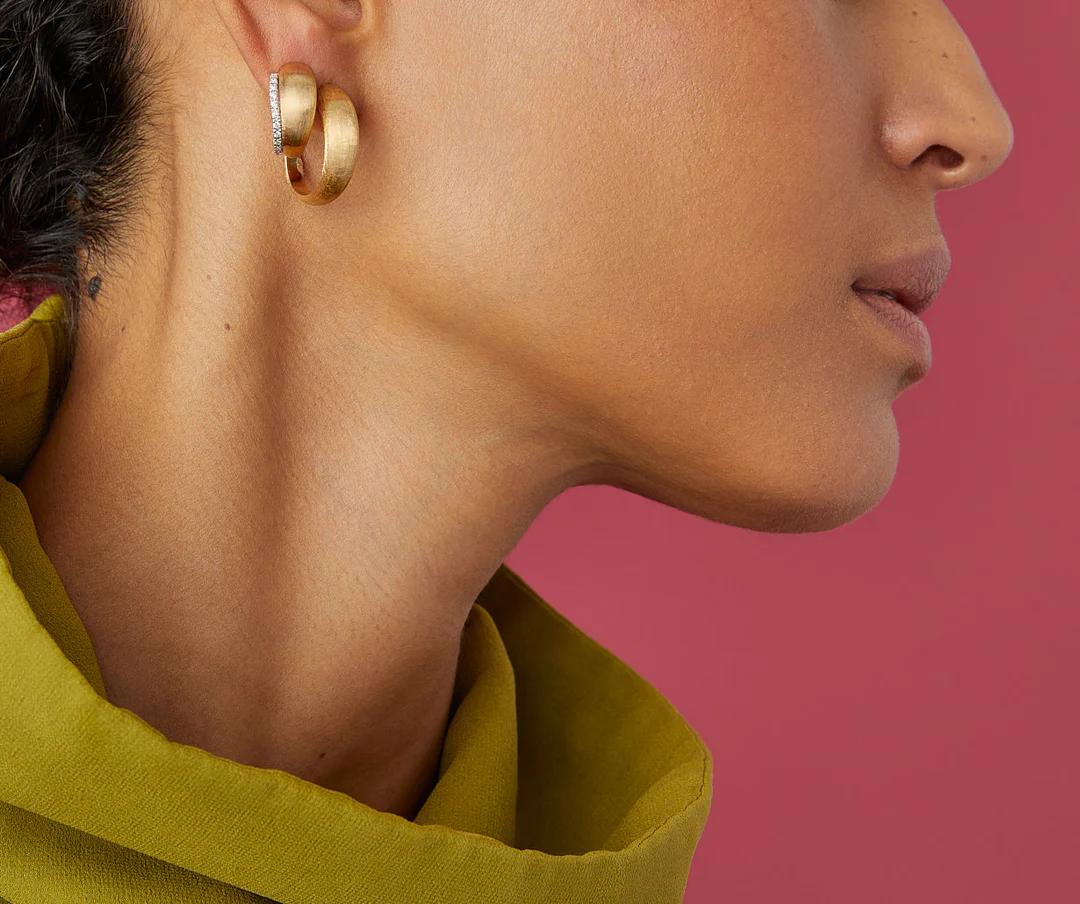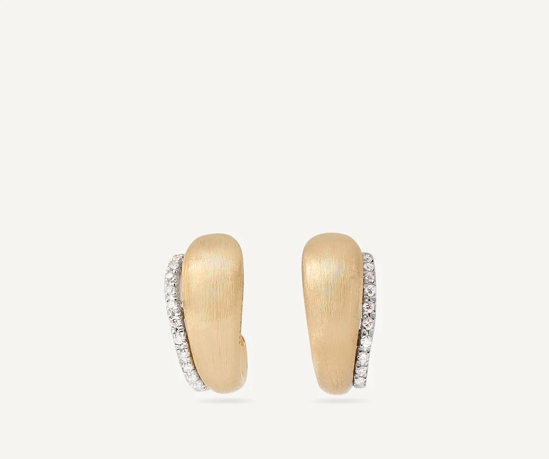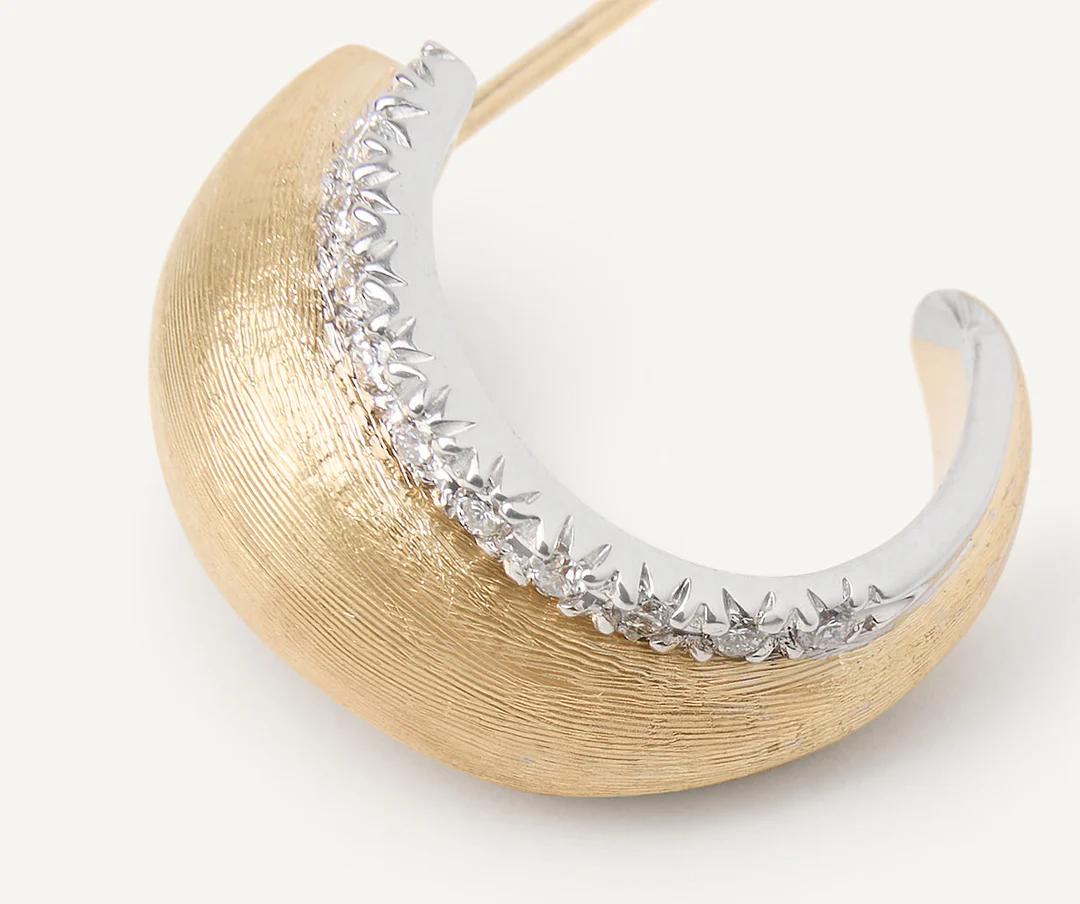 In versione mini, questo orecchino a cerchio in oro giallo 18kt è finemente inciso a mano con l’antica tecnica del bulino millerighe e impreziosito da una parentesi di pavé di diamanti taglio brillante, che illumina il viso rendendolo un vero gioiello must-have.