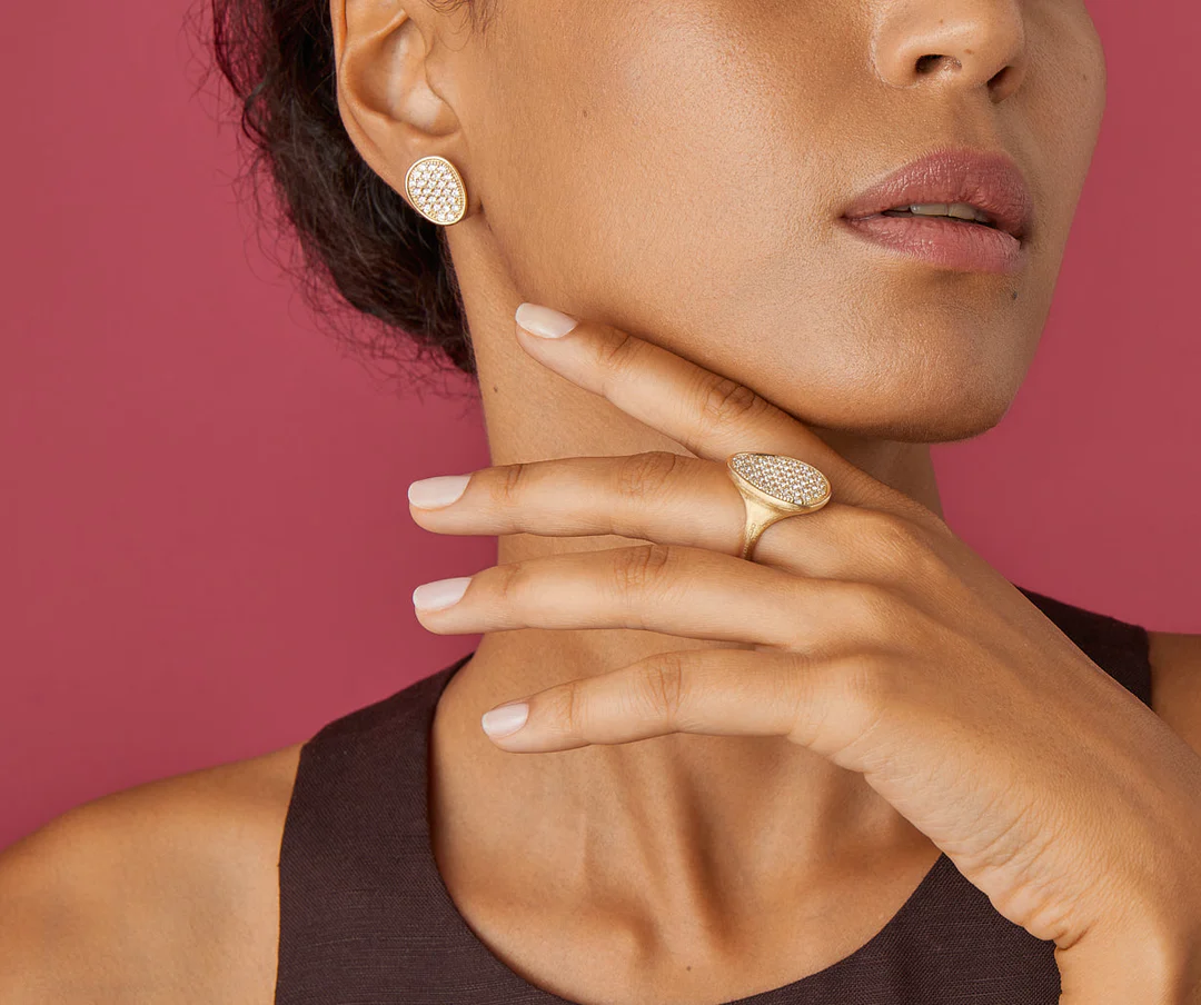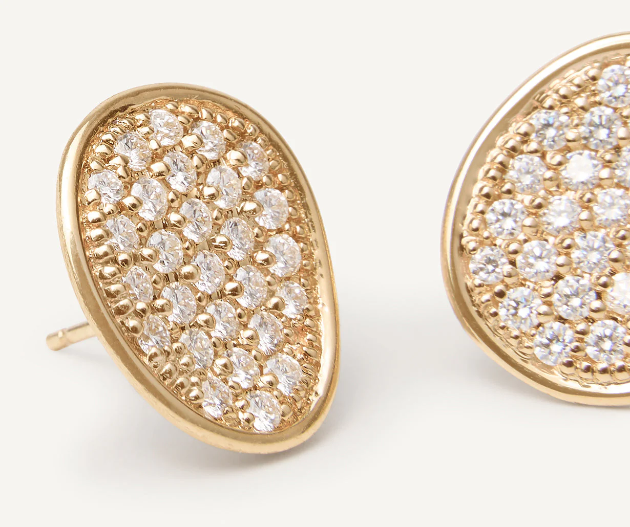 In oro giallo 18kt, questi orecchini a lobo dalle forme irregolari sono arricchiti da un delicatissimo pavé di diamanti che illumina il viso di chi li indossa. L’oro è finemente inciso a mano con l’antica tecnica del bulino millerighe.