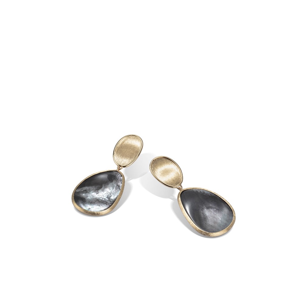 Questo orecchino Chandelier in oro giallo 18Kt è inciso a mano con l’antica tecnica del Bulino Millerighe ed è impreziosito da foglie di Madreperla grigia dal taglio esclusivo.