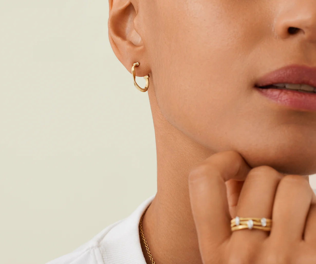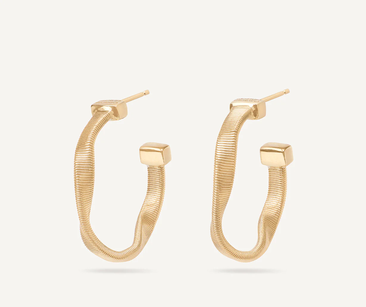 Intriganti orecchini a cerchio realizzati con un nastro d’oro giallo 18kt, realizzato grazie all’esclusiva lavorazione artigianale del coil e dolcemente ritorto su se stesso. L’effetto ad onda così ottenuto trasferisce un concetto di artigianalità e originalità che rende questo paio di orecchini davvero speciale.