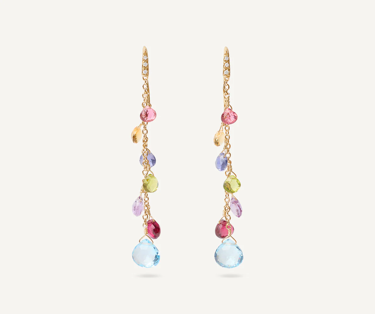Leggero ed elegante, questo orecchino pendente è caratterizzato da una pioggia di gemme multicolore dal caratteristico taglio a cuore. Impreziosito da un amo di diamanti taglio brillante, è un vero must-have.
