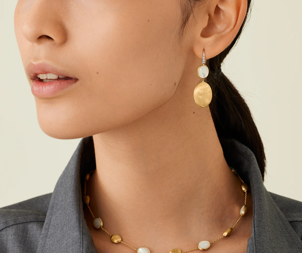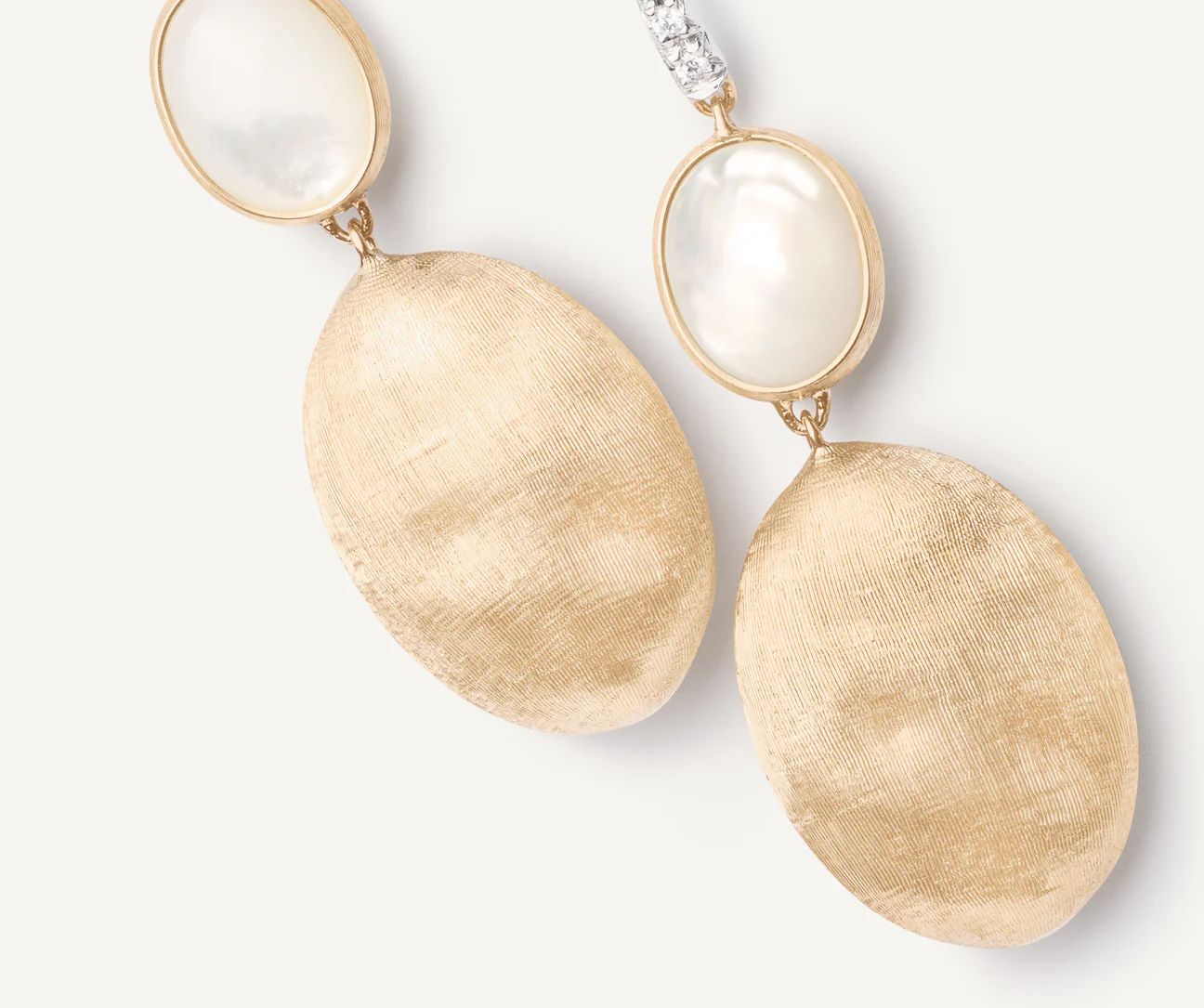 Questo orecchino pendente in oro 18kt è caratterizzato da una madreperla bianca e un’ovalina dalla superficie irregolare, finemente incisa a mano con l’antica tecnica del bulino millerighe. Il gioiello è ulteriormente impreziosito da un amo in pavé di diamanti taglio brillante.