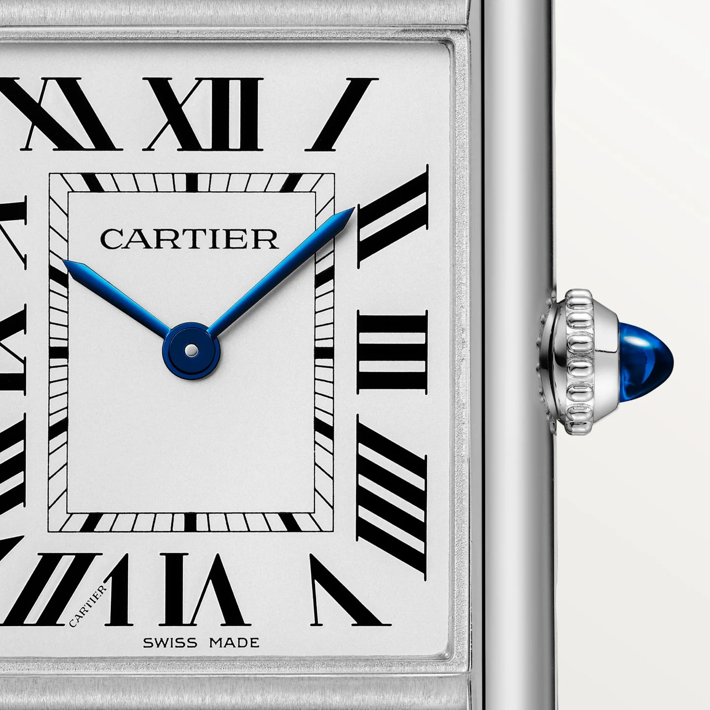 Orologio Tank Must, modello grande, movimento fotovoltaico SolarBeat™. Cassa in acciaio, corona perlata ornata di uno spinello sintetico cabochon, quadrante argentato, lancette a forma di gladio in acciaio azzurrato, bracciale in acciaio, fibbia pieghevole. Dimensioni della scatola: 33,7 x 25,5 mm, spessore: 6,6 mm. Impermeabile fino a 30 metri.