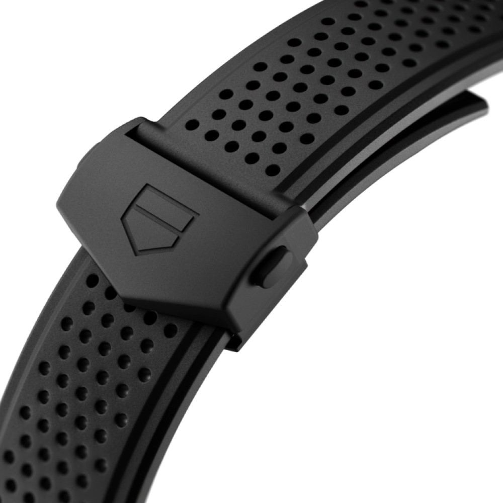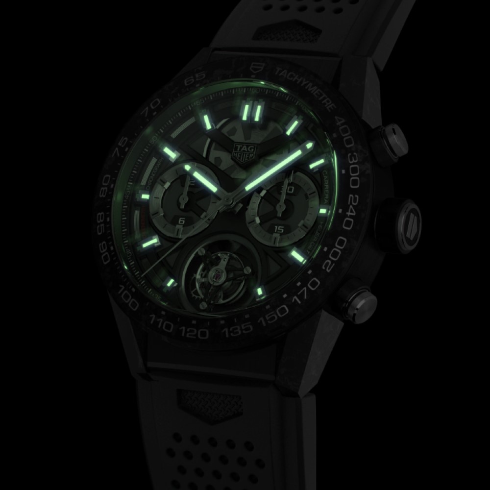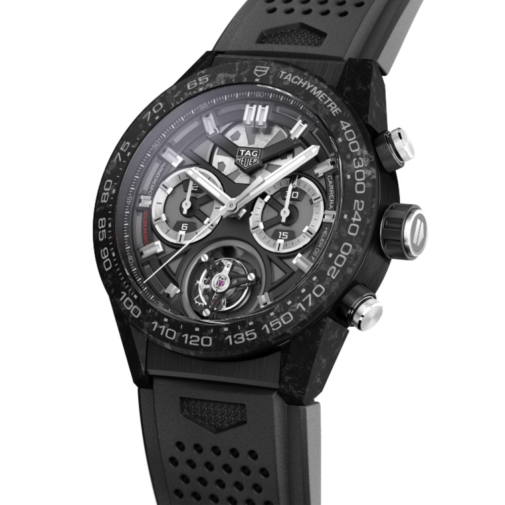 Un modello TAG Heuer Carrera Heuer 02 Tourbillon nero, che usufruisce appieno dei materiali più distintivi usati per produrre orologi sportivi high-tech: titanio con rivestimento in PVD nero per la cassa da 45 mm, fibra di carbonio per la lunetta fissa con scala tachimetrica e per le iconiche anse. Questo calibro vanta una straordinaria riserva di carica di 80 ore.