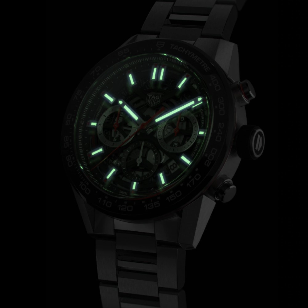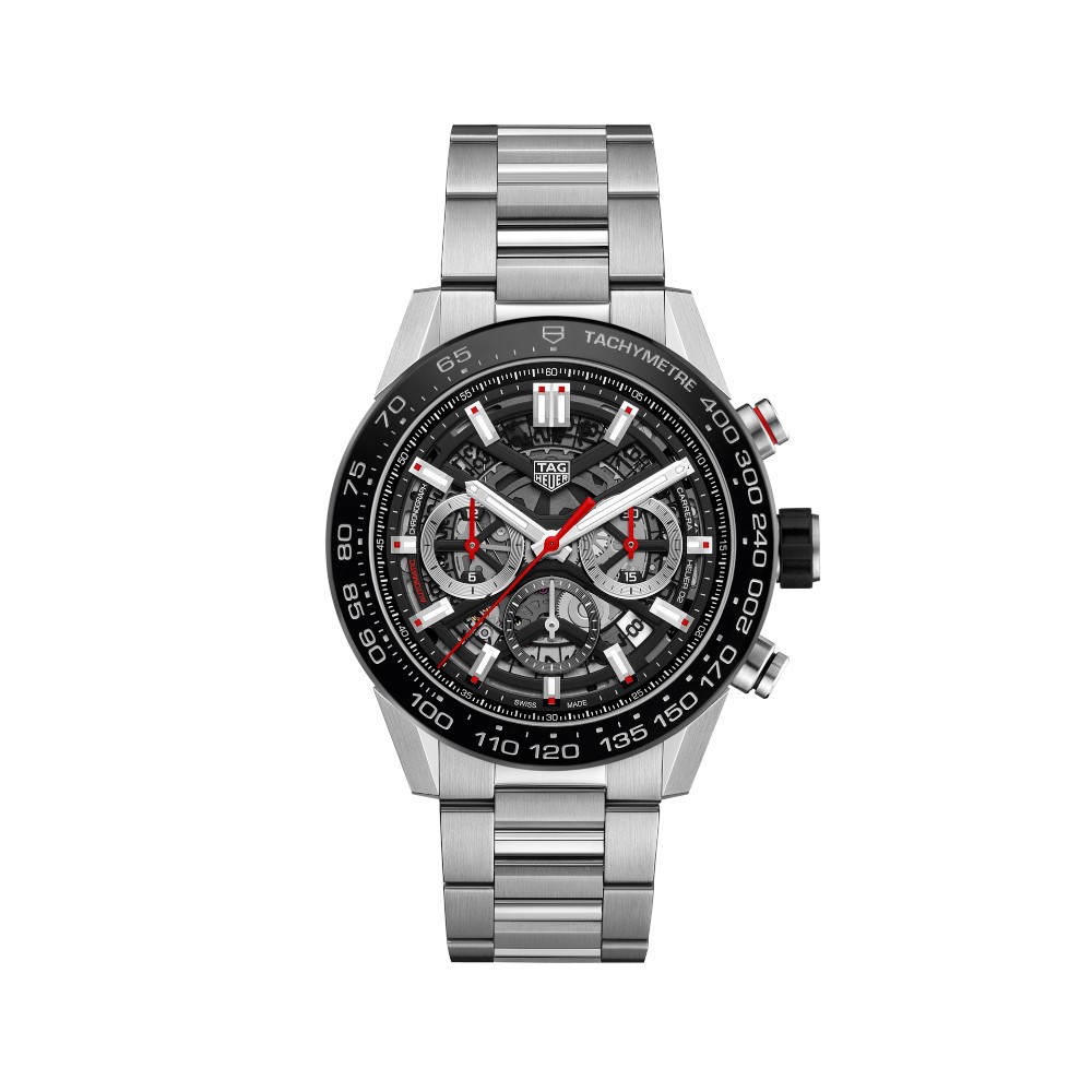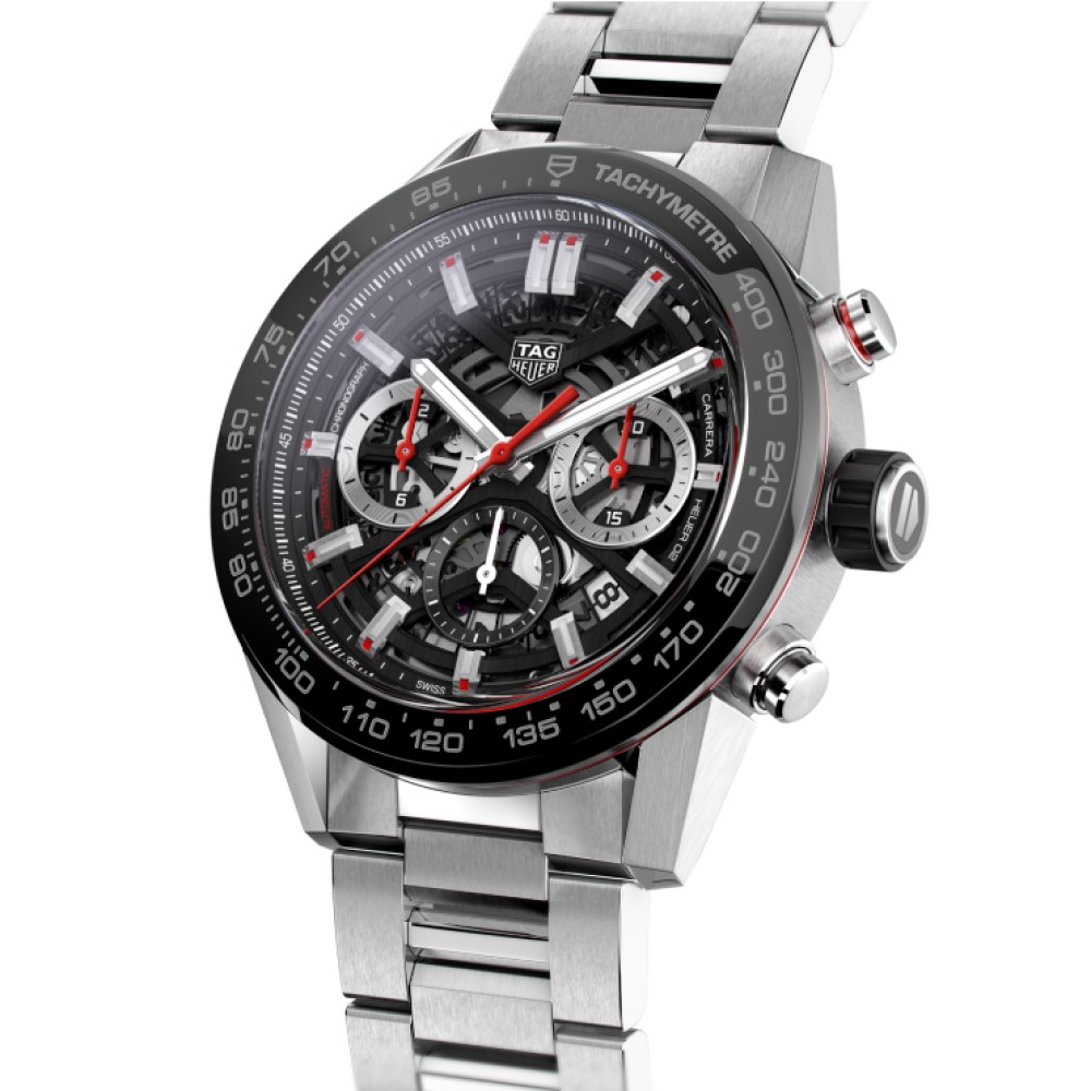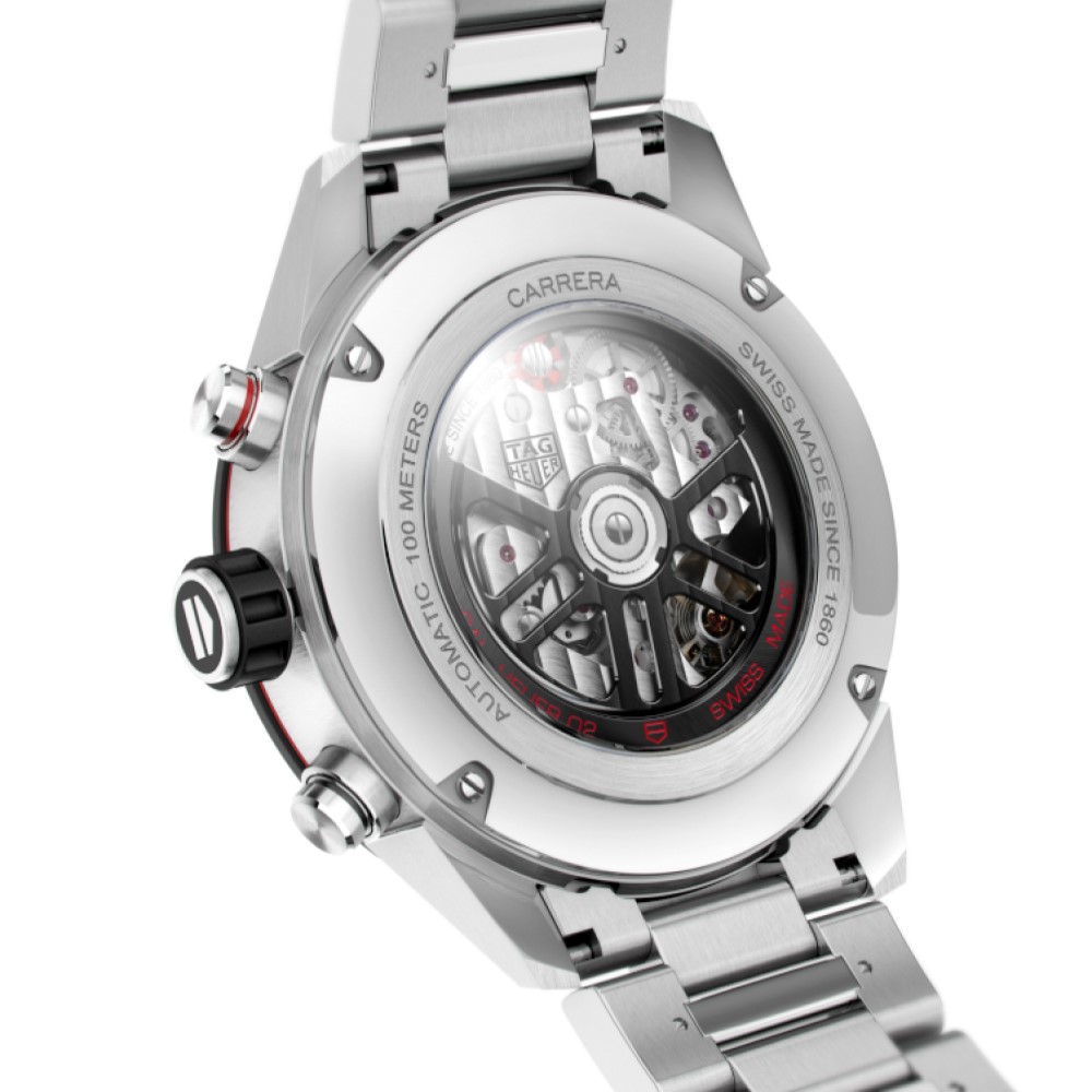 Questo modello TAG Heuer Carrera è animato dallo straordinario movimento di manifattura Heuer 02, con 80 ore di riserva di carica. Questo segnatempo inoltre presenta un quadrante nero, una cassa da 45 mm in acciaio e una lunetta fissa con scala tachimetrica in ceramica nera. I contatori azzurrati a ore 3, 6 e 9 sono rodiati con lancette laccate rosse.