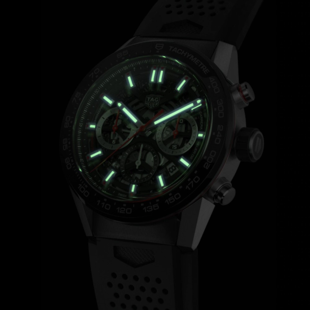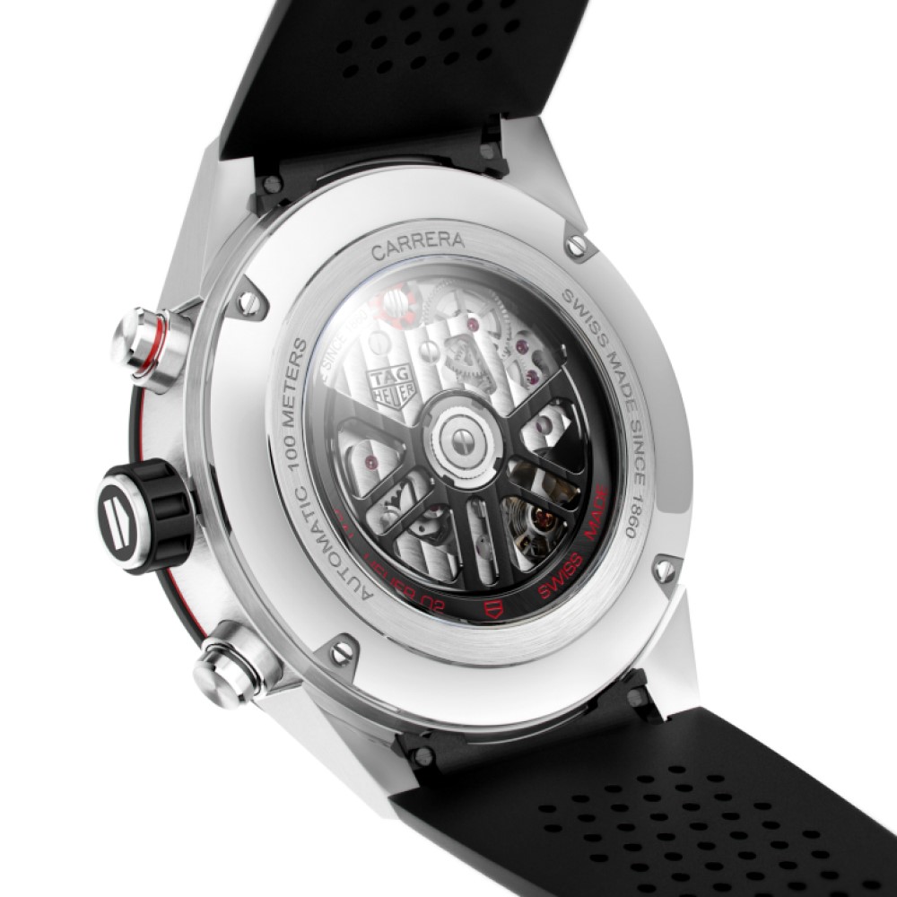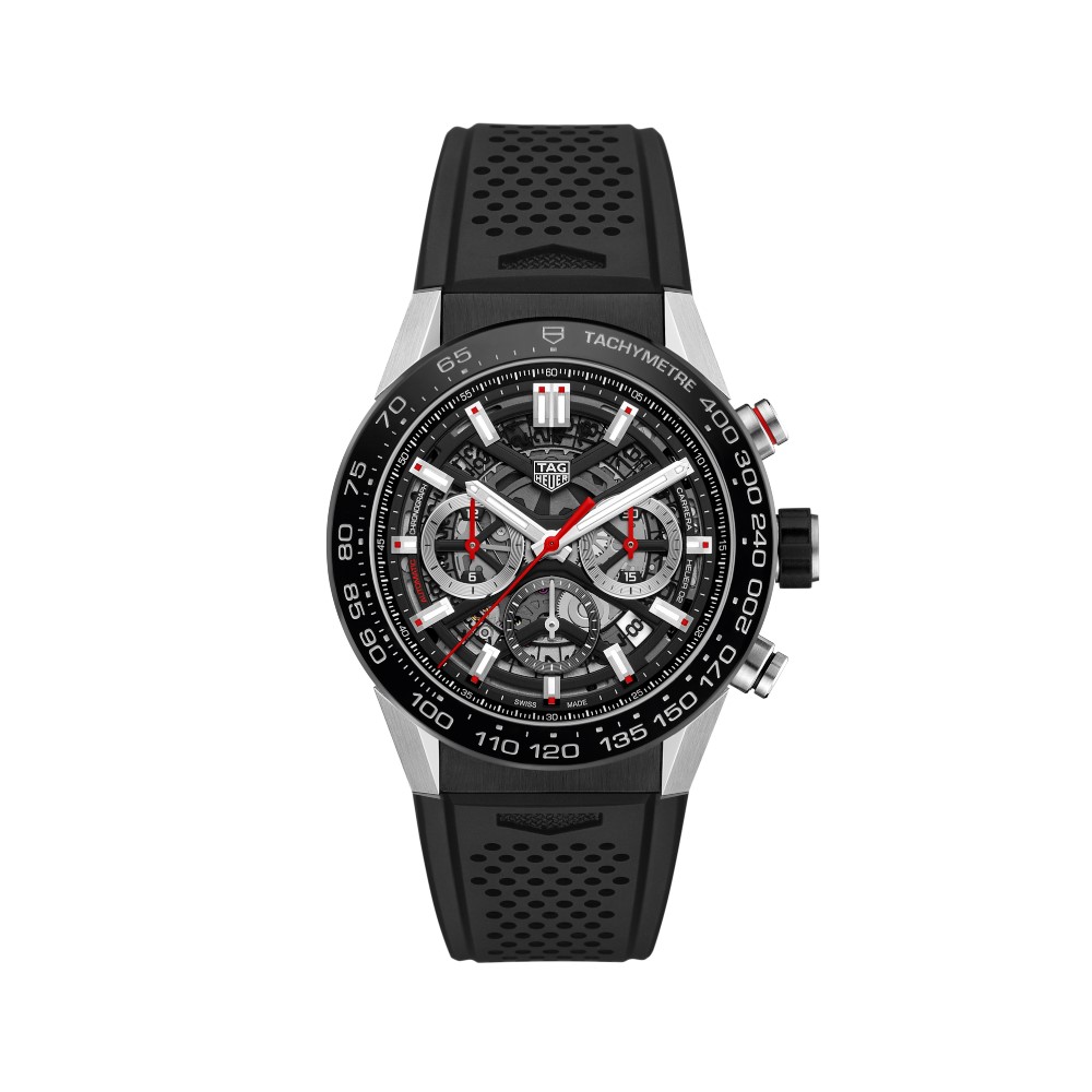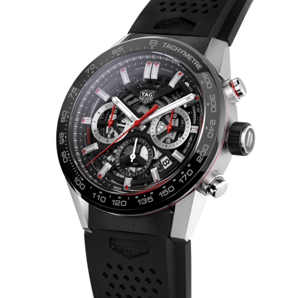Un modello TAG Heuer Carrera nero in acciaio e ceramica. Il movimento automatico di manifattura Heuer 02 è visibile attraverso il quadrante scheletrato e il fondello in vetro zaffiro. Una creazione all’avanguardia, realizzata per la massima precisione e affidabilità, con una straordinaria riserva di carica di 80 ore.
