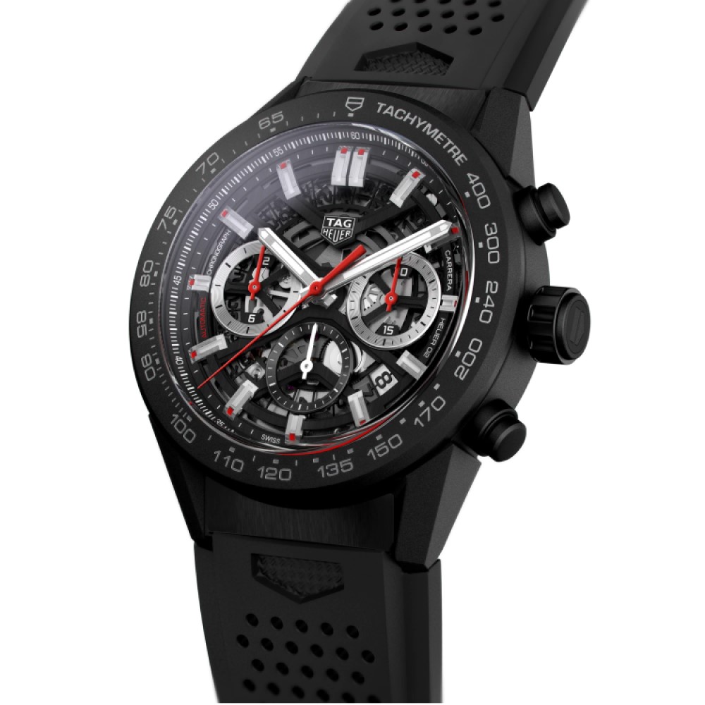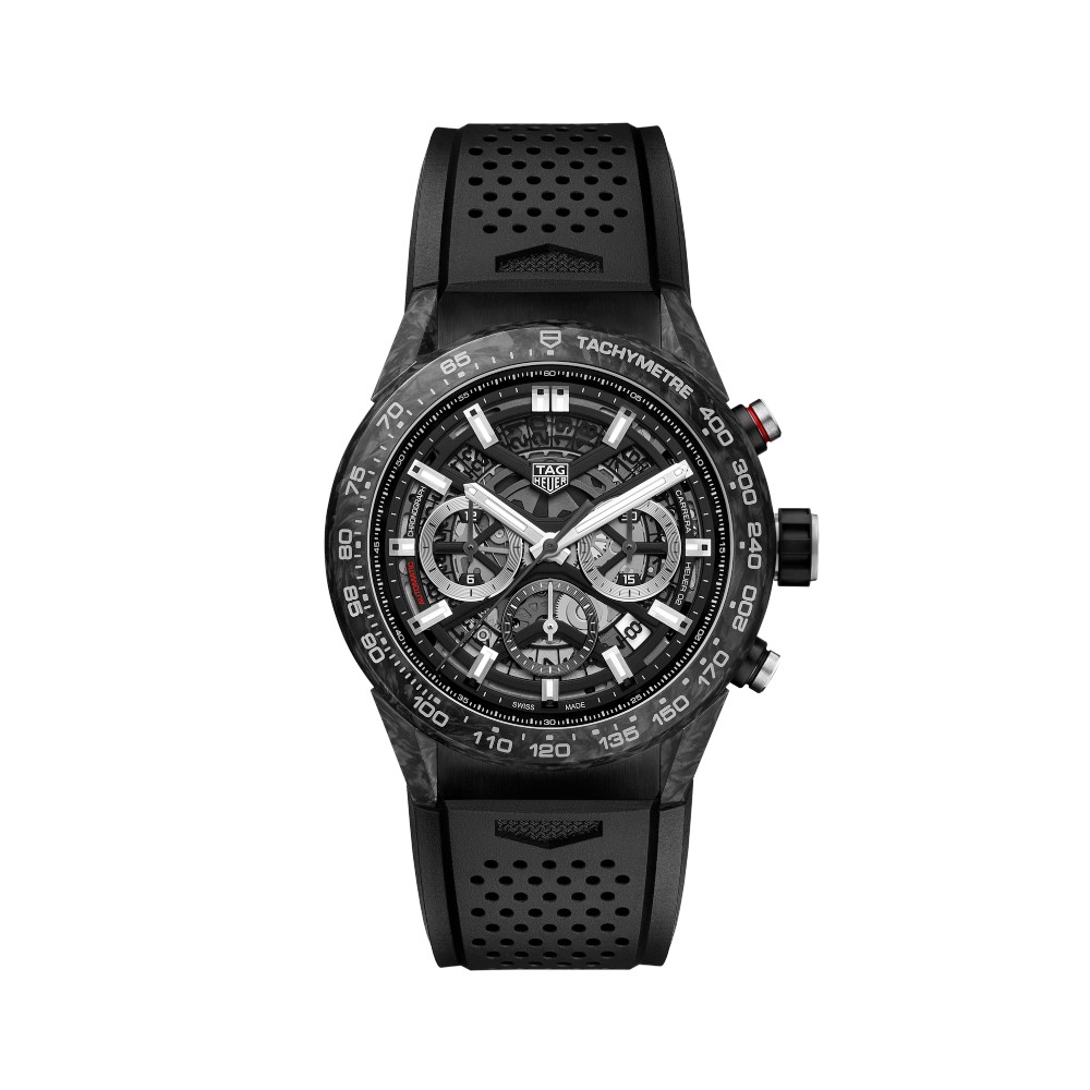 Un’edizione nera del TAG Heuer Carrera, con cassa, lunetta e anse in fibra di carbonio e cinturino nero in caucciù traforato ispirato al mondo delle corse automobilistiche. Il movimento automatico di manifattura Heuer 02 è visibile attraverso il quadrante scheletrato e il fondello in vetro zaffiro e acciaio con rivestimento in PVD nero, e dispone di 80 ore di riserva di carica.