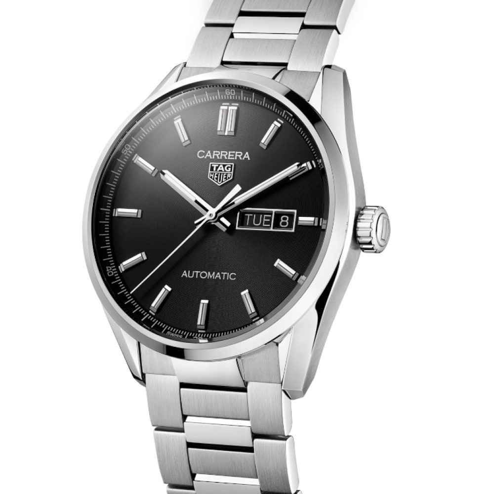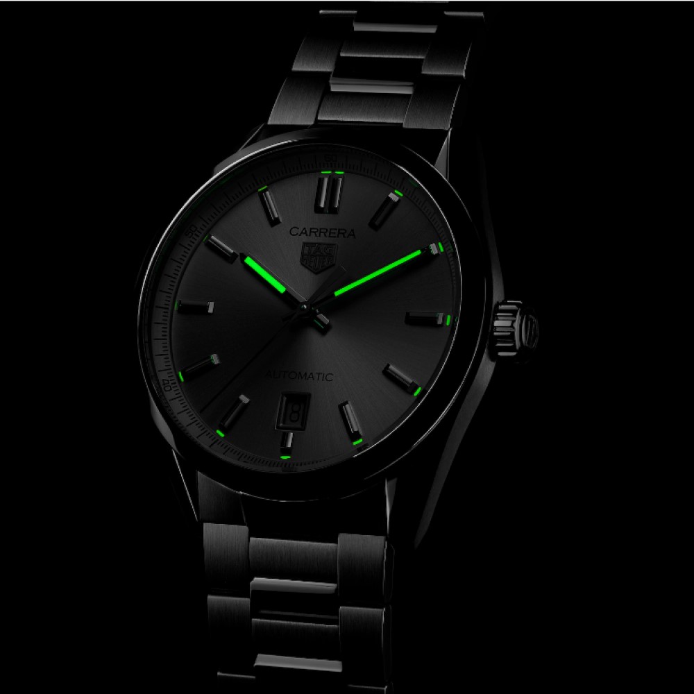 Questo TAG Heuer Carrera è pronto a tutto. Il quadrante argento spazzolato effetto soleil è un’affermazione di lusso, elegantemente impreziosito dal pratico logo TAG Heuer rodiato e da lancette e indici Super-Luminova®.