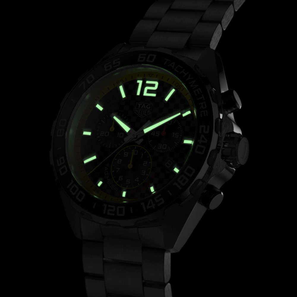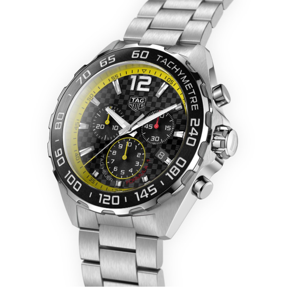 Elegante, dinamico, audace: un’icona dei motori con quadrante scuro effetto fibra di carbonio in contrasto con il rehaut della scala 60 secondi/minuti e la punta della lancetta centrale dal colore giallo. Per dominare la strada tenendo ben salde le mani sul volante.