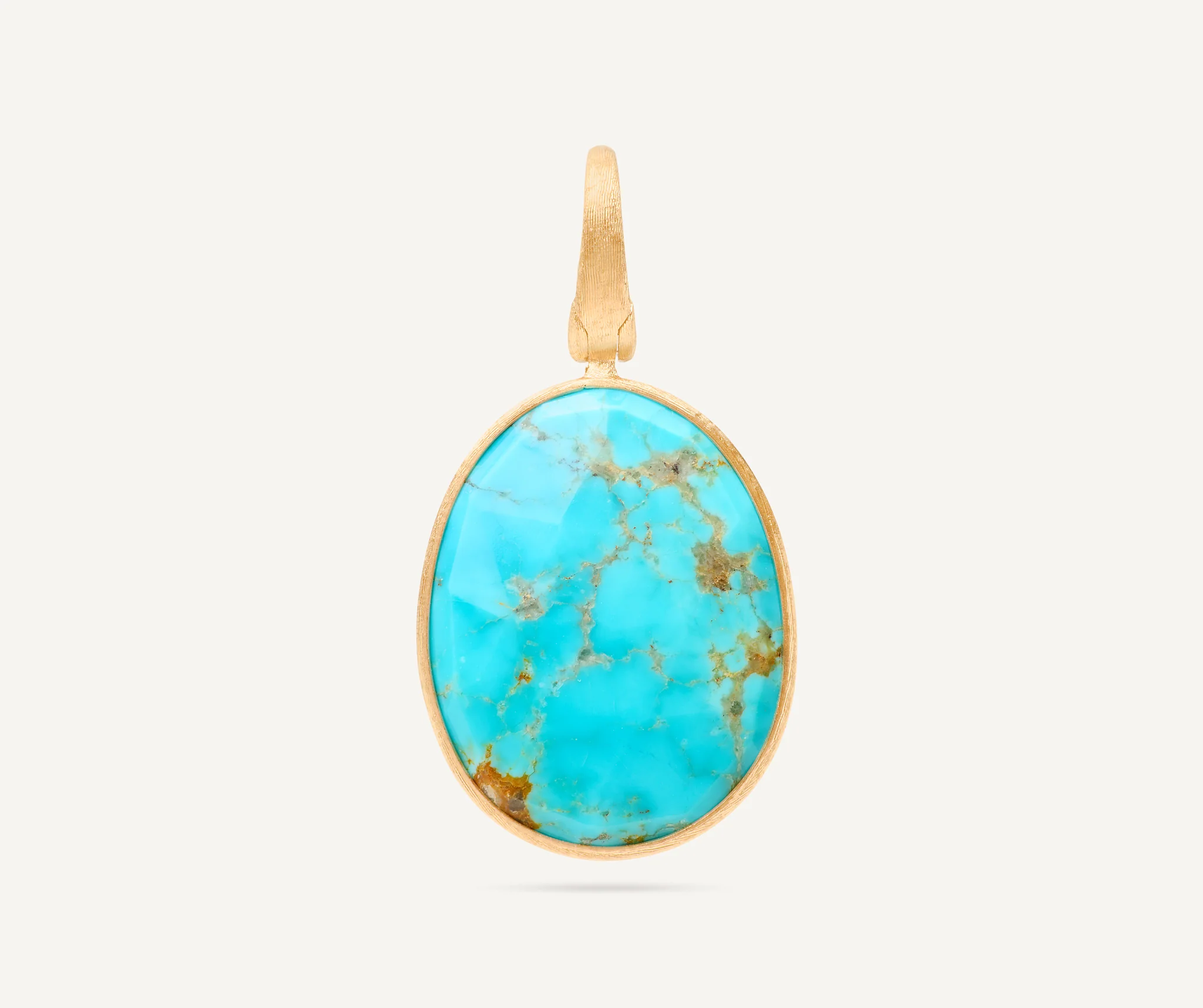 Questo pendente presenta un elegante turchese naturale dalle sfaccettature esclusive, incastonata in una ghiera in oro giallo 18 carati finemente incisa a mano con l’antica tecnica del bulino millerighe.