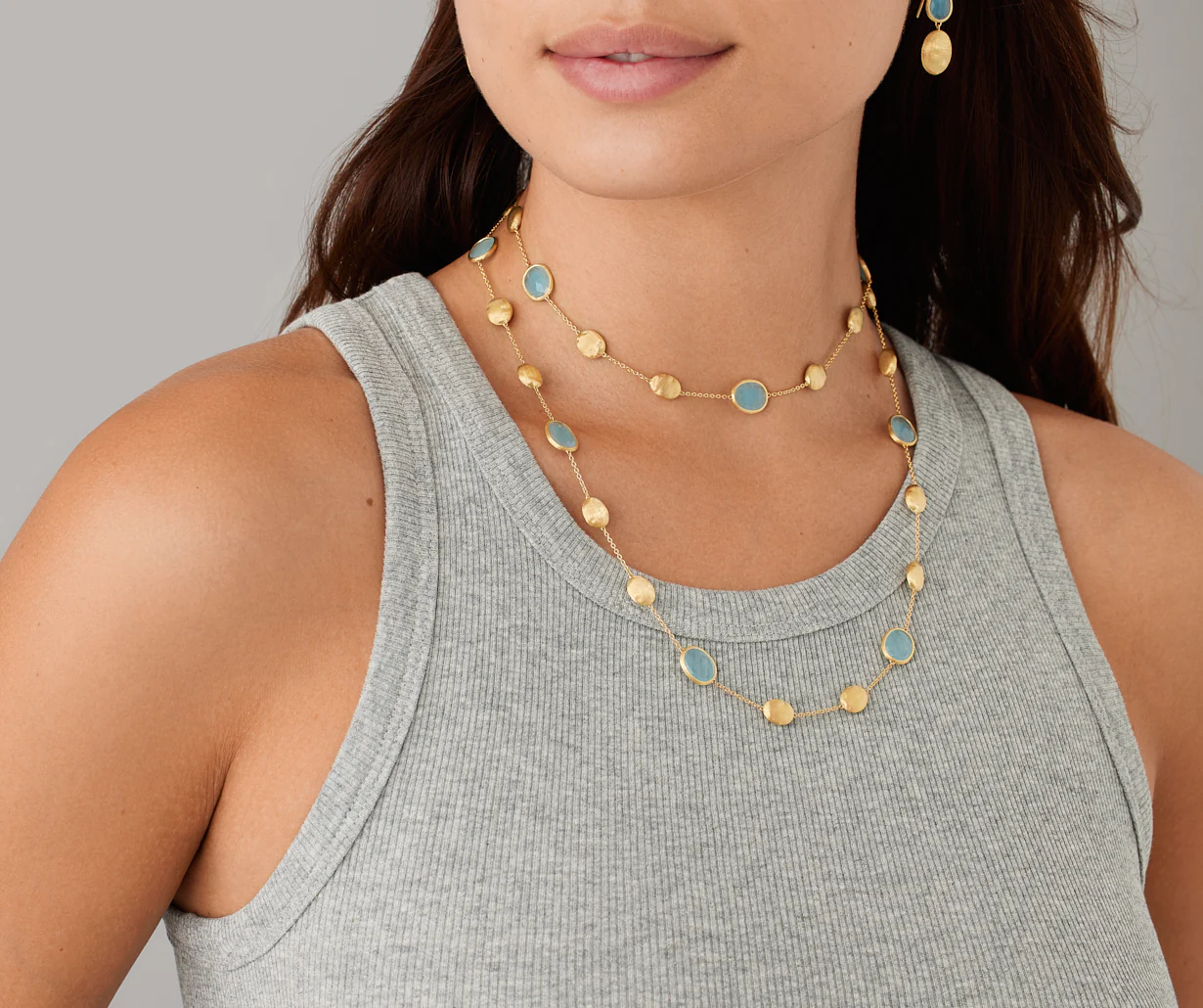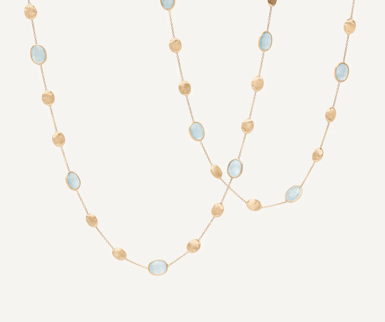Un sautoir in oro giallo 18kt leggero ed elegante: un susseguirsi di ovali dalla superficie irregolare, finemente incisi a mano con l’antica tecnica del bulino millerighe, alternati a selezionatissime acquemarine milky. Perfetto anche raddoppiato, dona un certo “non so che” che sa di leggerezza, energia e gioia di vivere.