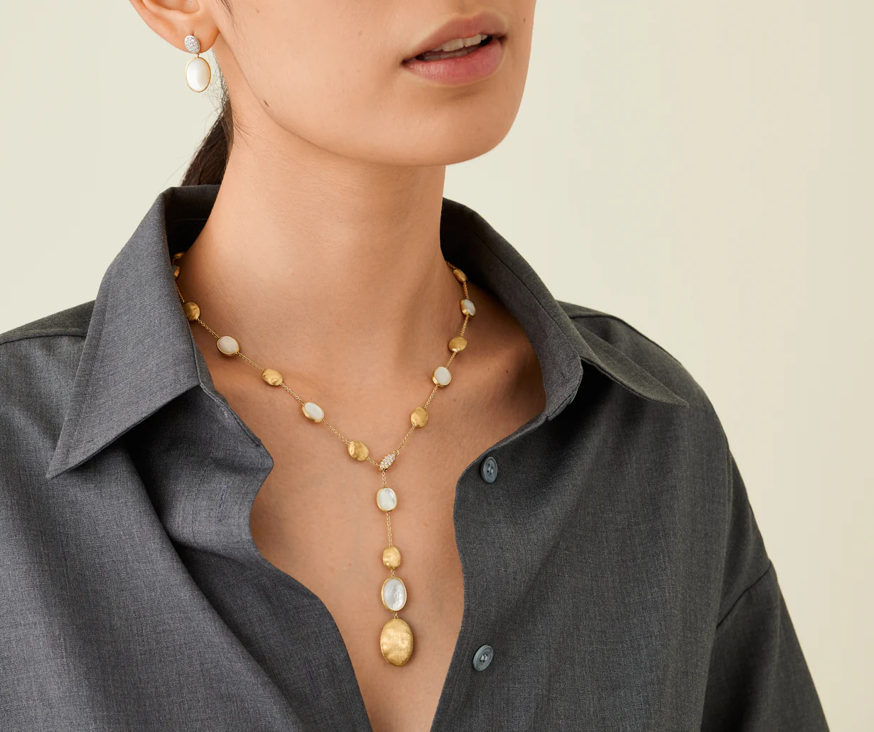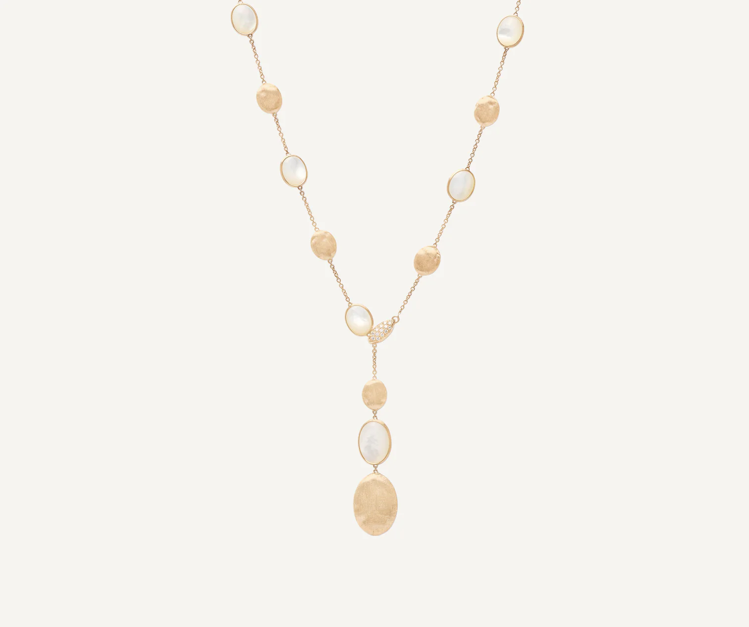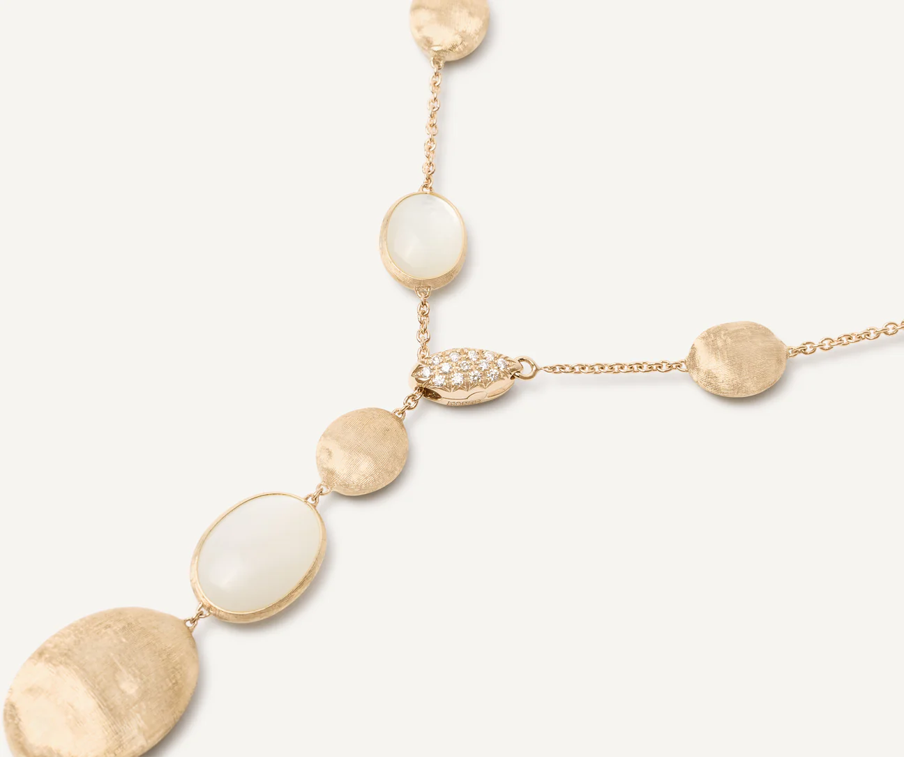 Dal look fresco e sofisticato, questa collana a cravatta alterna selezionatissime madreperle bianche a ovaline in oro giallo 18kt, finemente incise a mano con l’antica tecnica del bulino millerighe, per un effetto di straordinaria lucentezza e setosità al tatto. La chiusura a molletta in pavé di diamanti taglio brillante permette di modificarne la lunghezza a piacimento e di indossarla in svariate combinazioni.